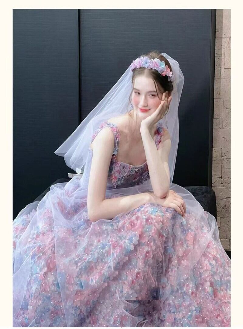 全身にほどこされたお花モチーフが大人可愛いカラードレス。