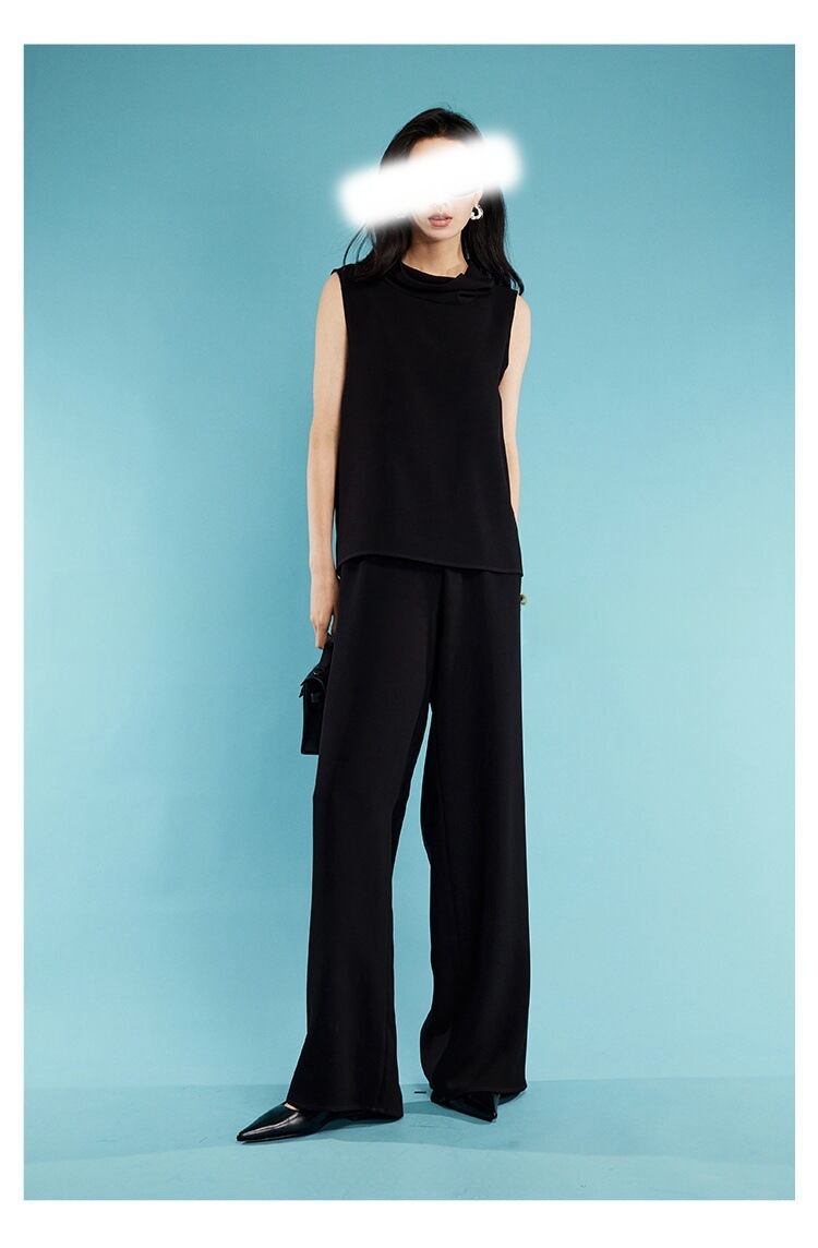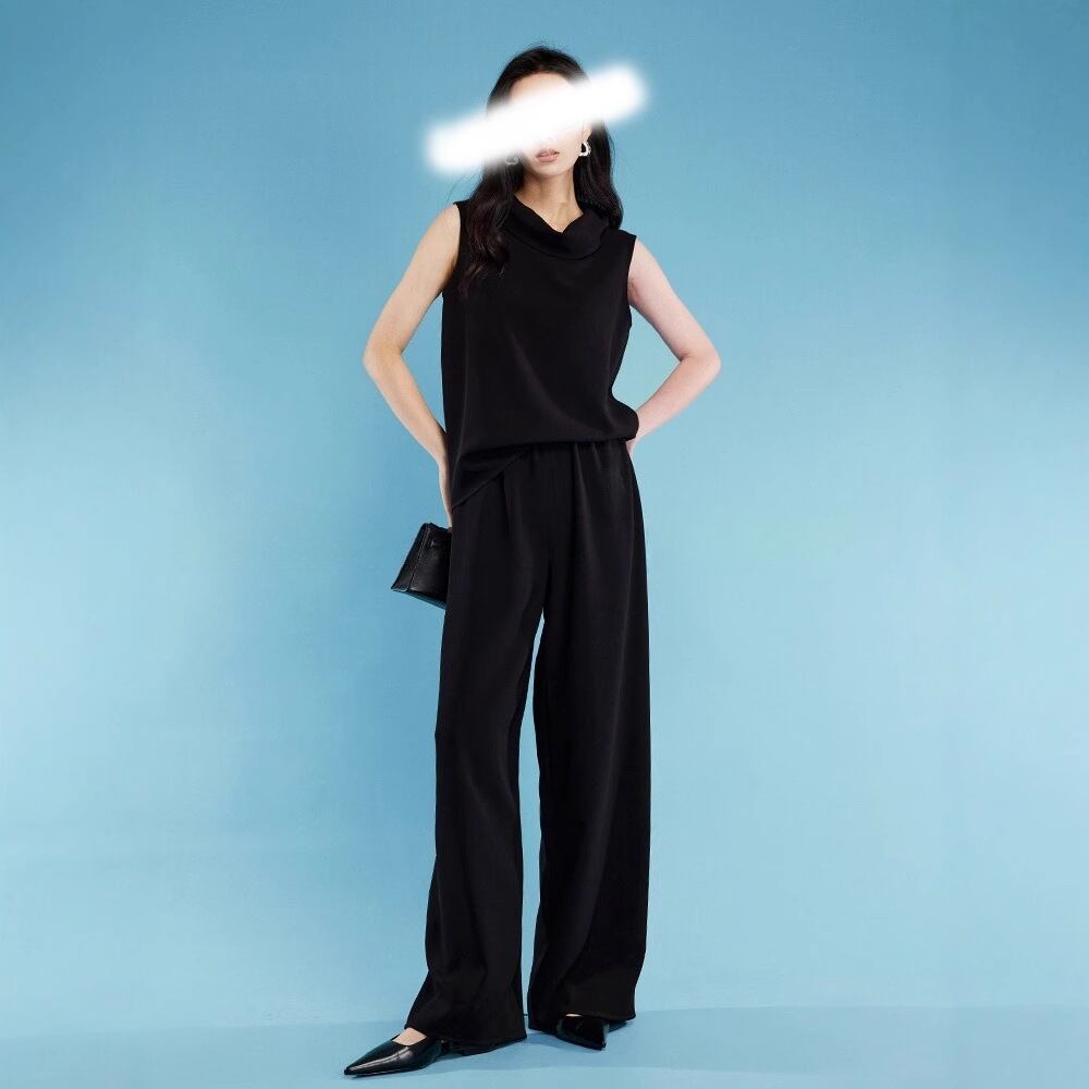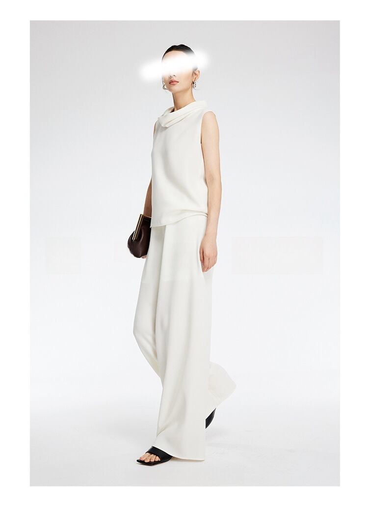 首元のドレープが上品さ引き立つセットアップタイプのパンツドレス。
