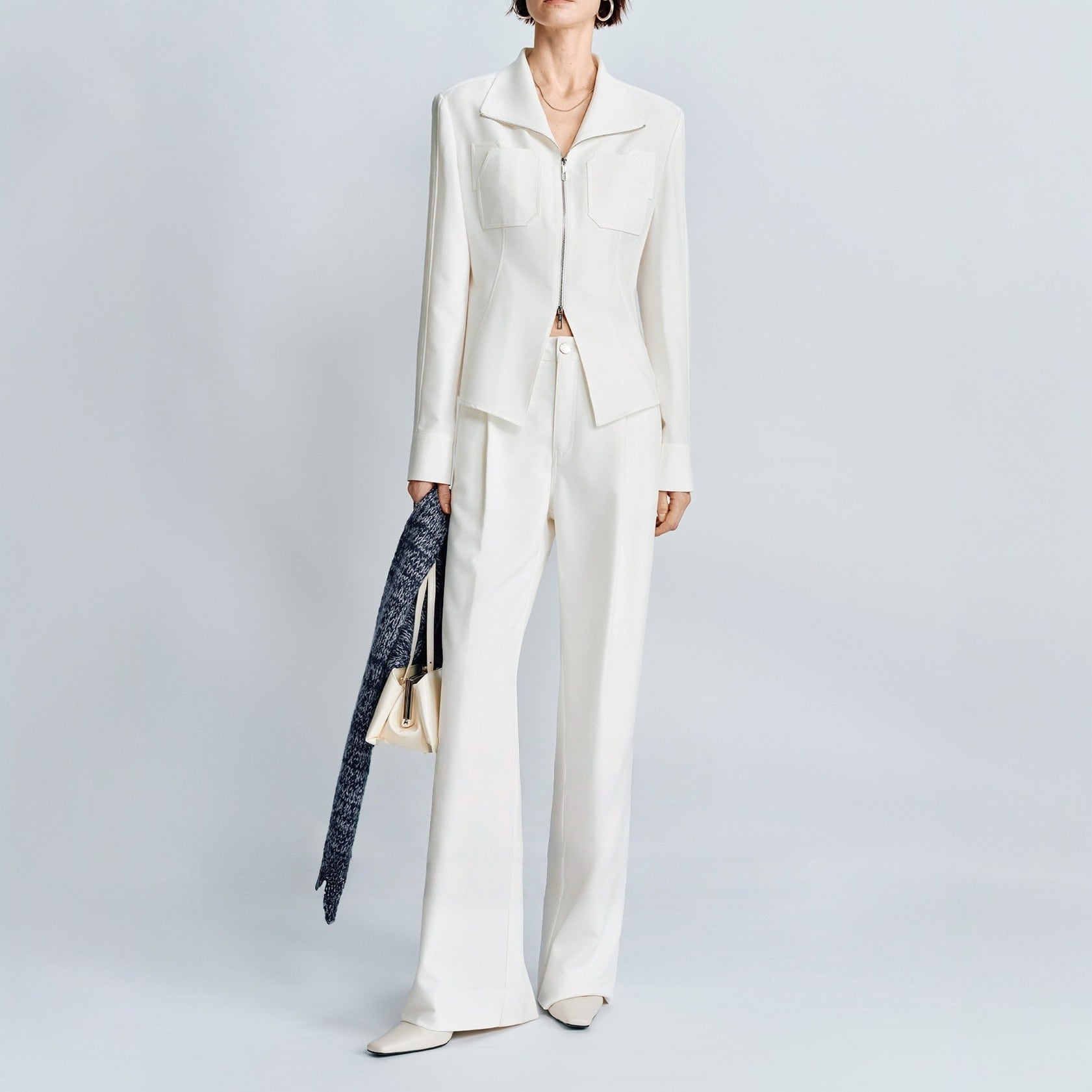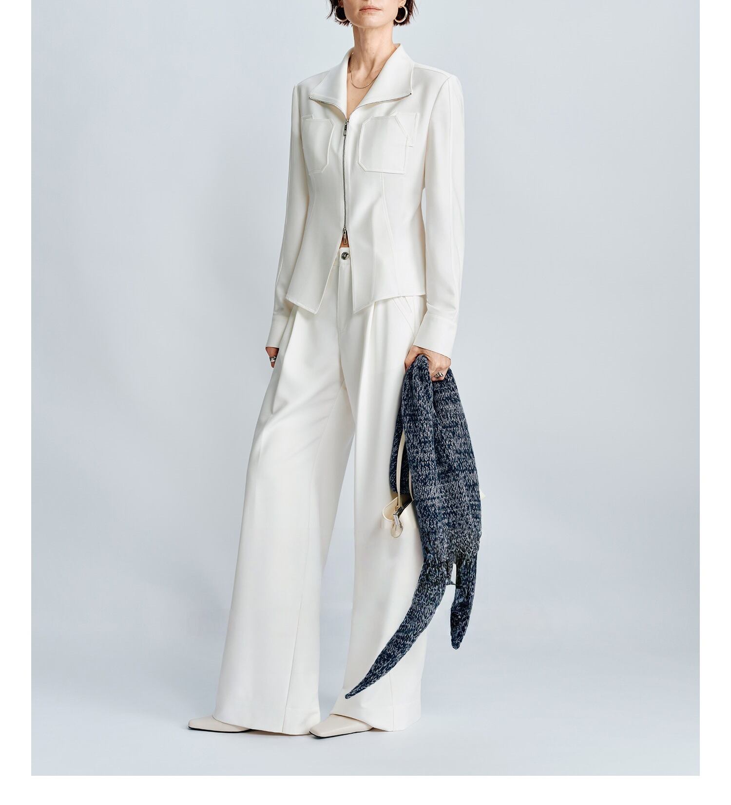 クールなフロントジップジャケット+ワイドパンツのセットアップパンツドレス。