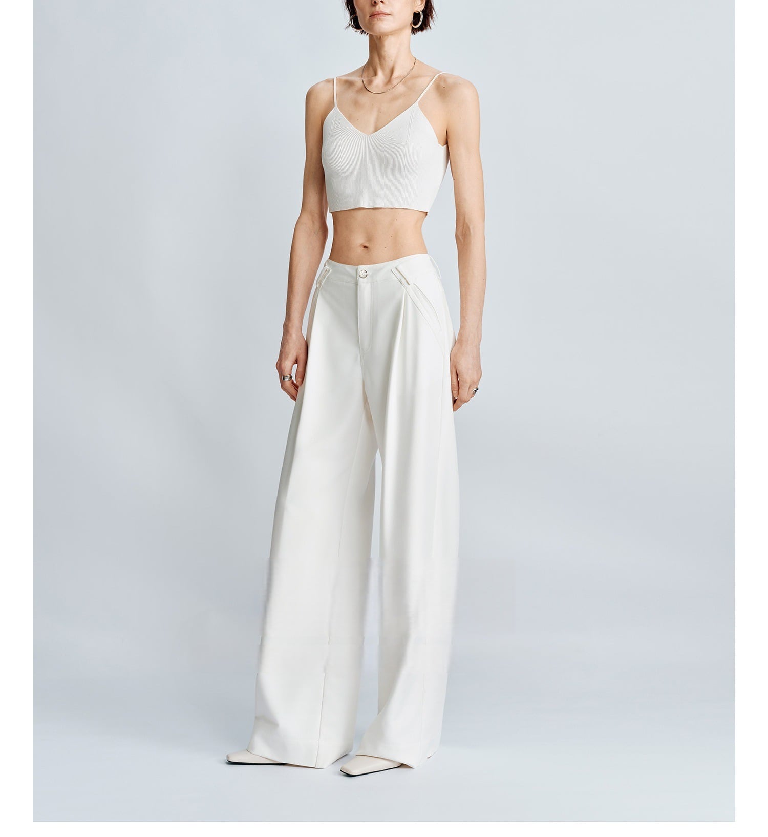 ウエストタック入りで腰まわりをカバーしお腹まわりをすっきりと見せる。