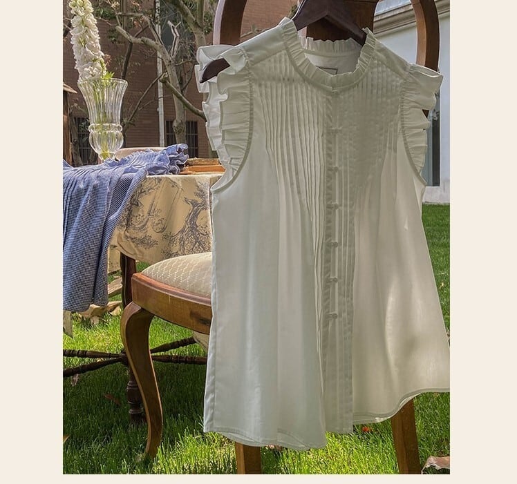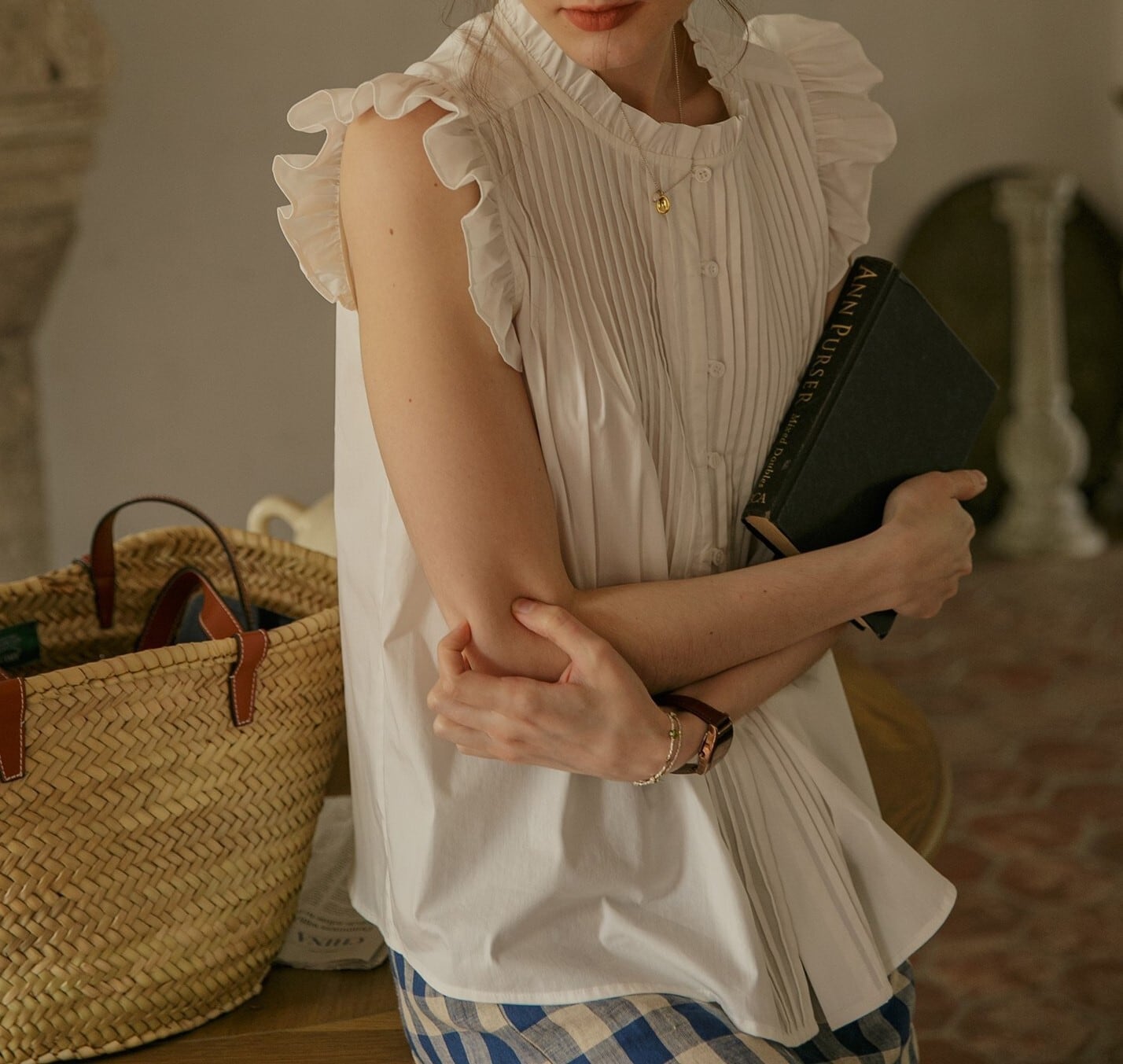 お袖とお首まわりのフリルが清楚で女性らしい抜け感をプラス。