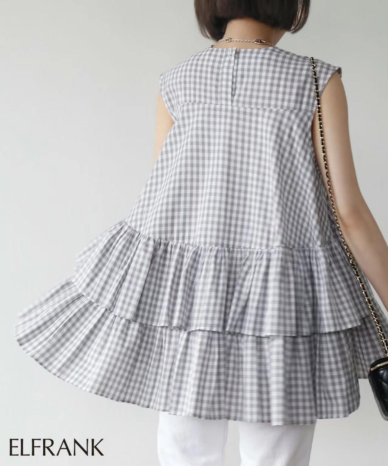 大人可愛いギンガムチェックのティアードブラウス。