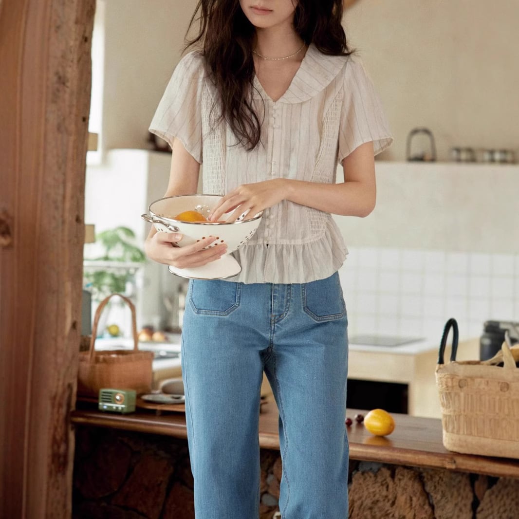 大人可愛いストライプデザインペプラムブラウス。