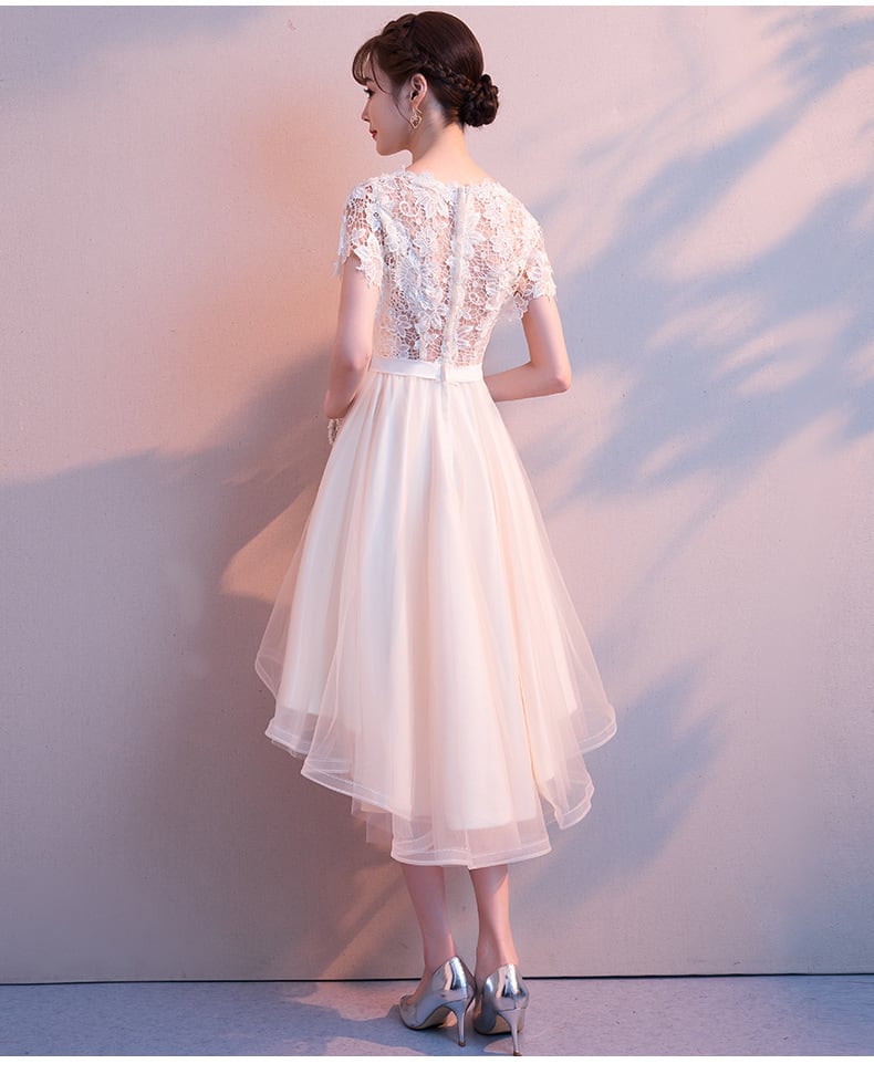 透け感ある総レースのお袖と大きなウエストリボンがアクセント。