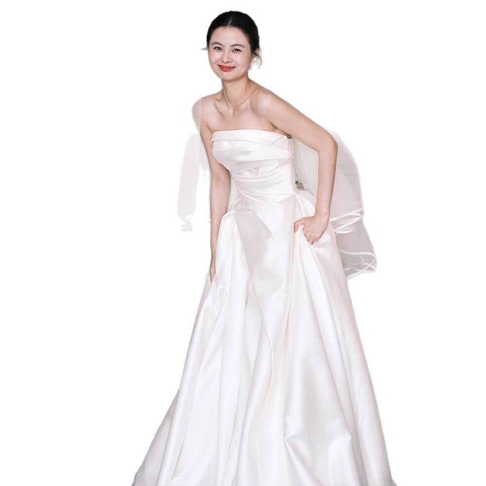 上質なサテン生地のハリのあるウェディングドレス。