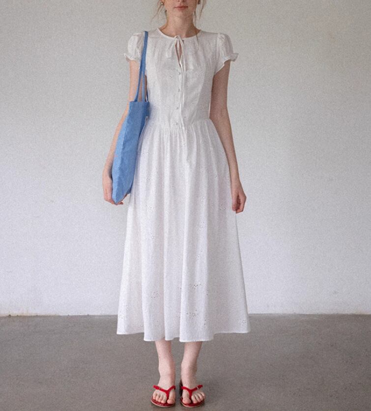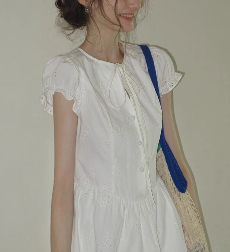 パフスリーブと襟元のリボンが可愛らしいワンピース。