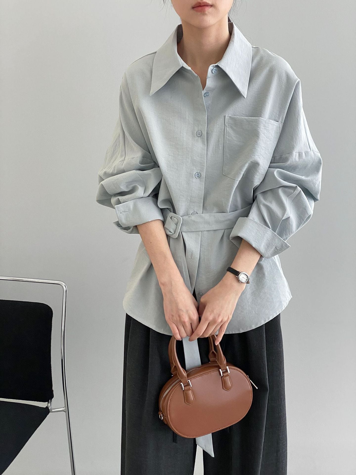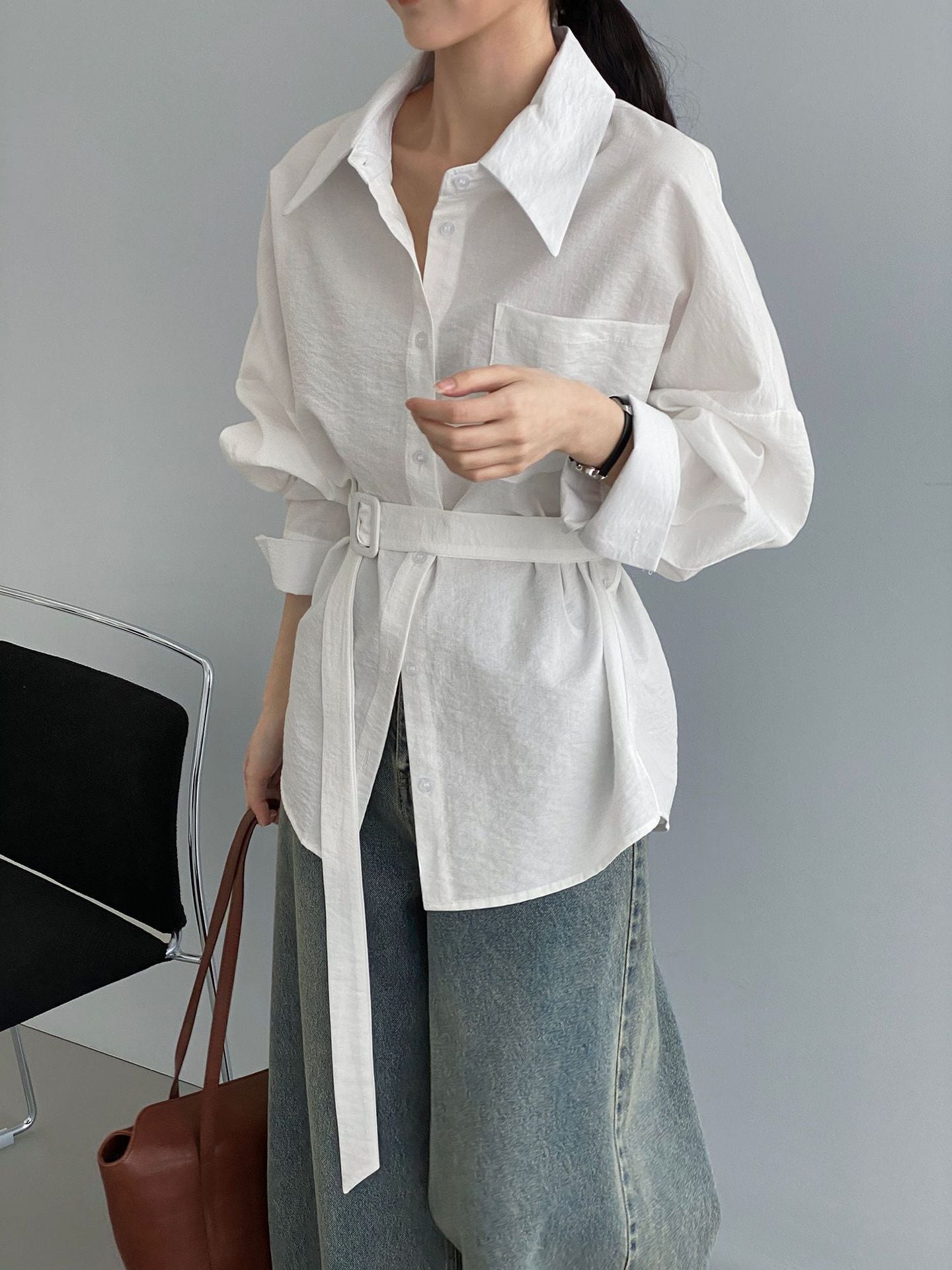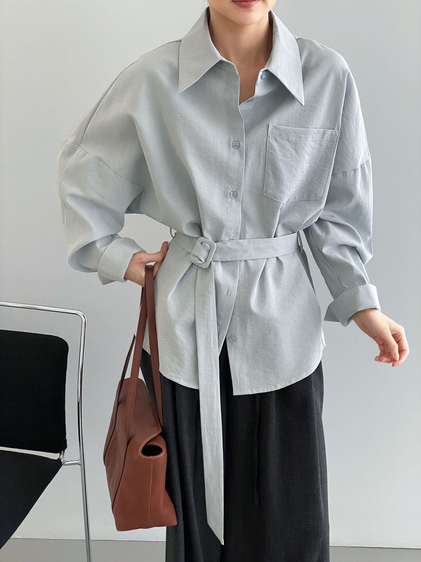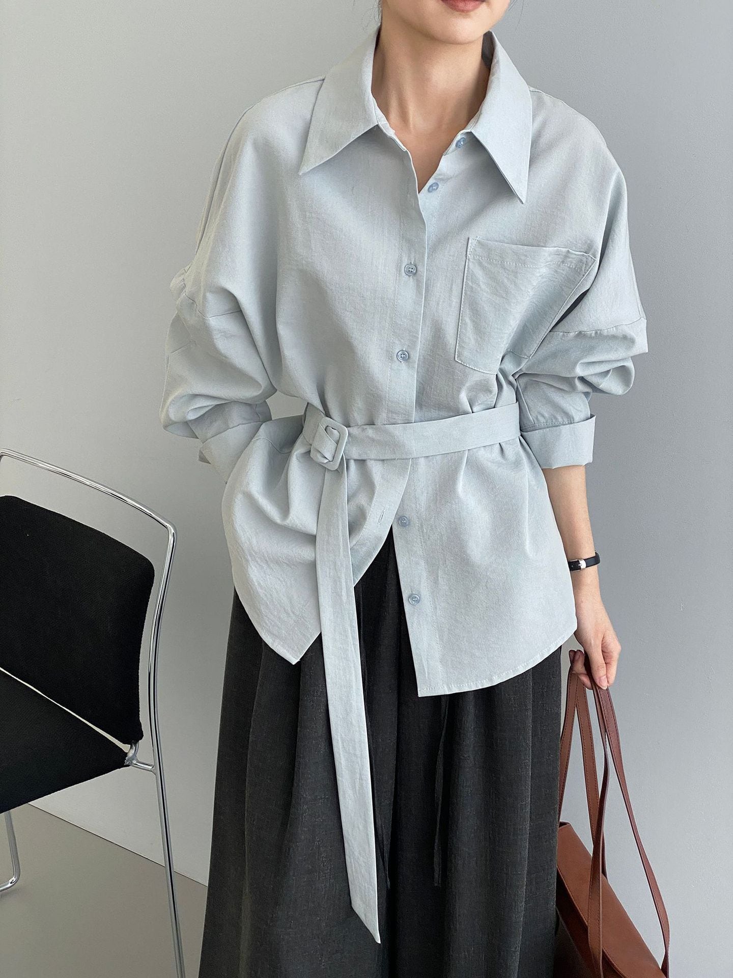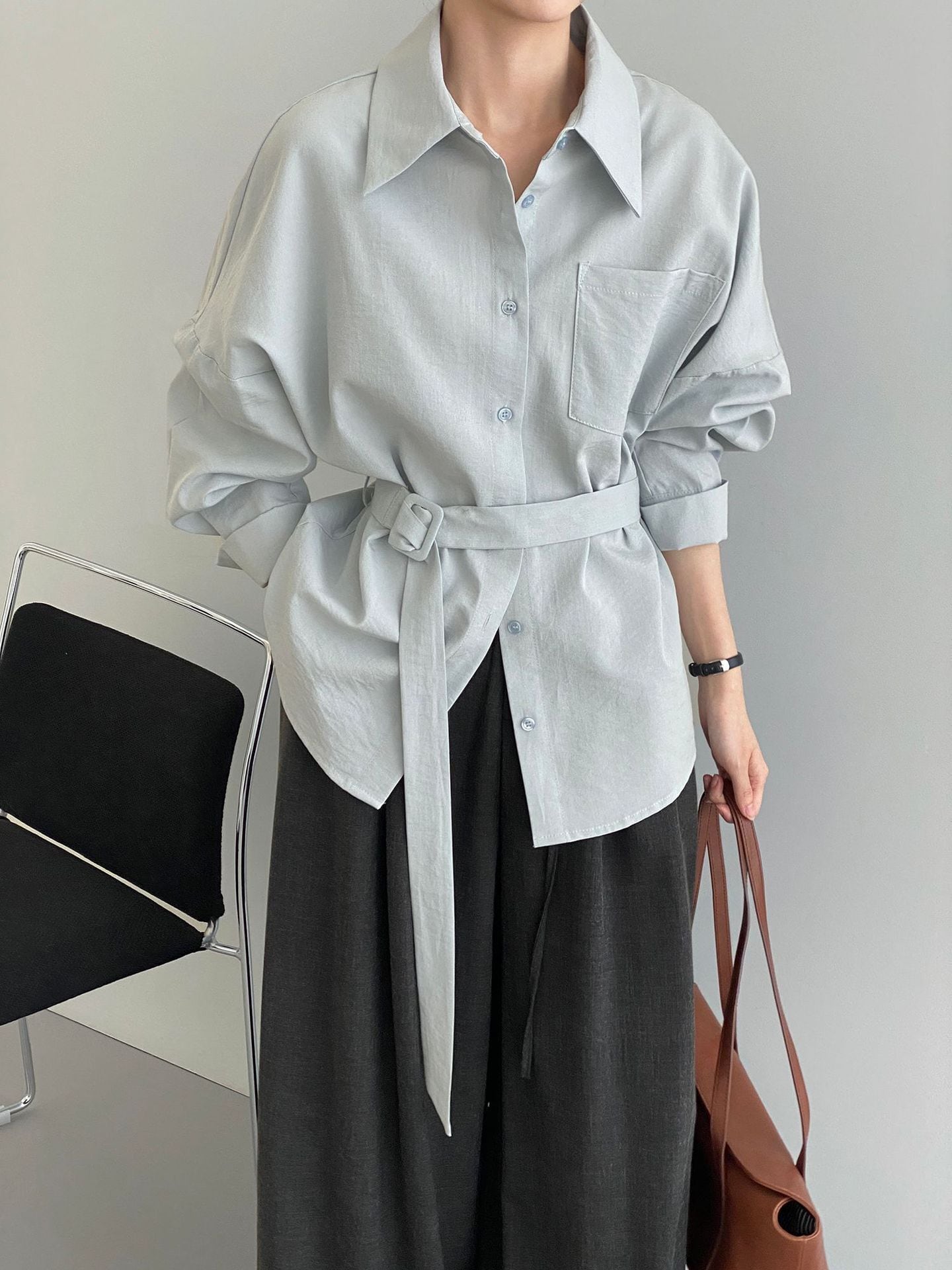 ウエストベルトできゅっと腰位置を引き締めるシャツ。