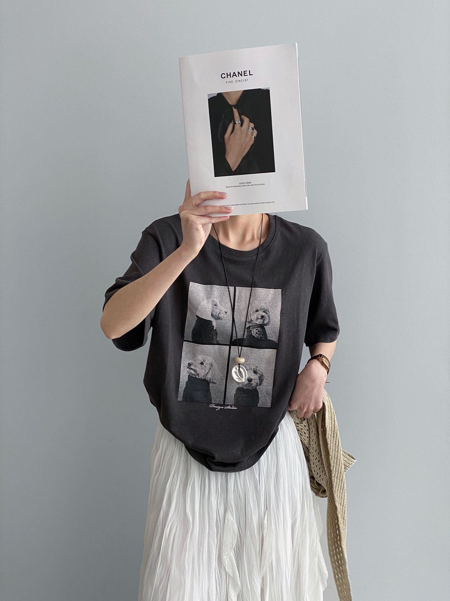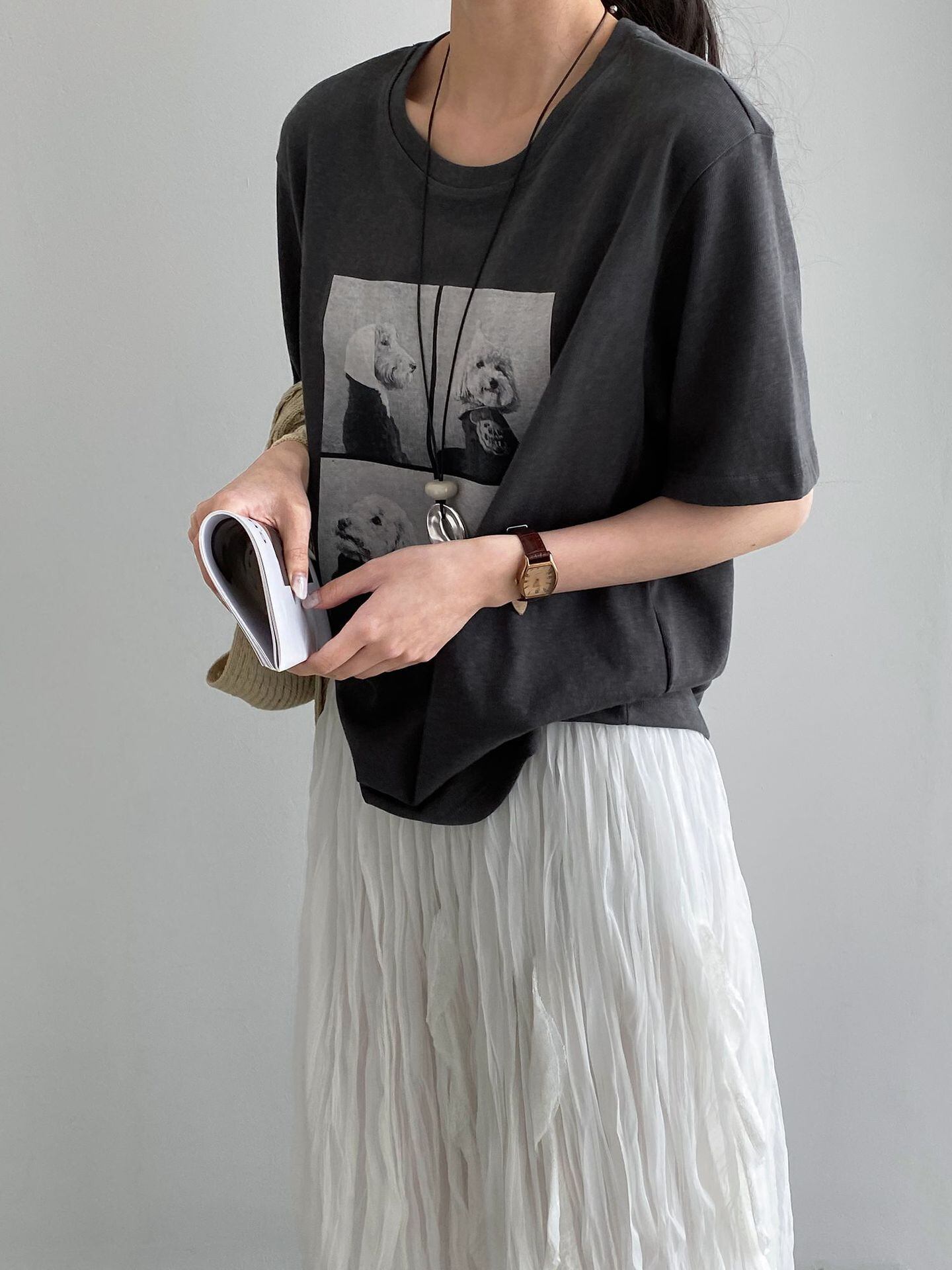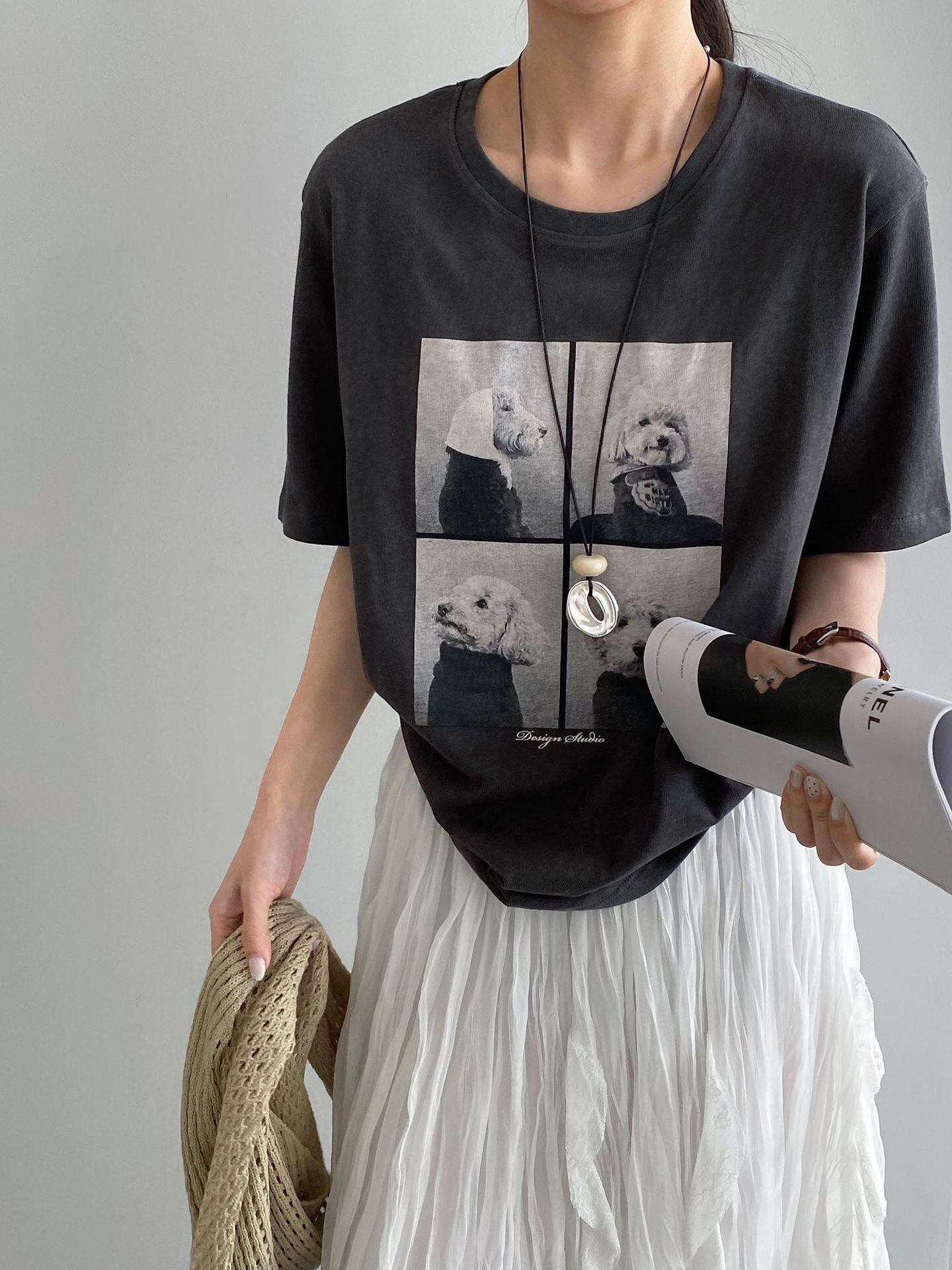 バストの犬モチーフが大人可愛いシンプルなtシャツ。