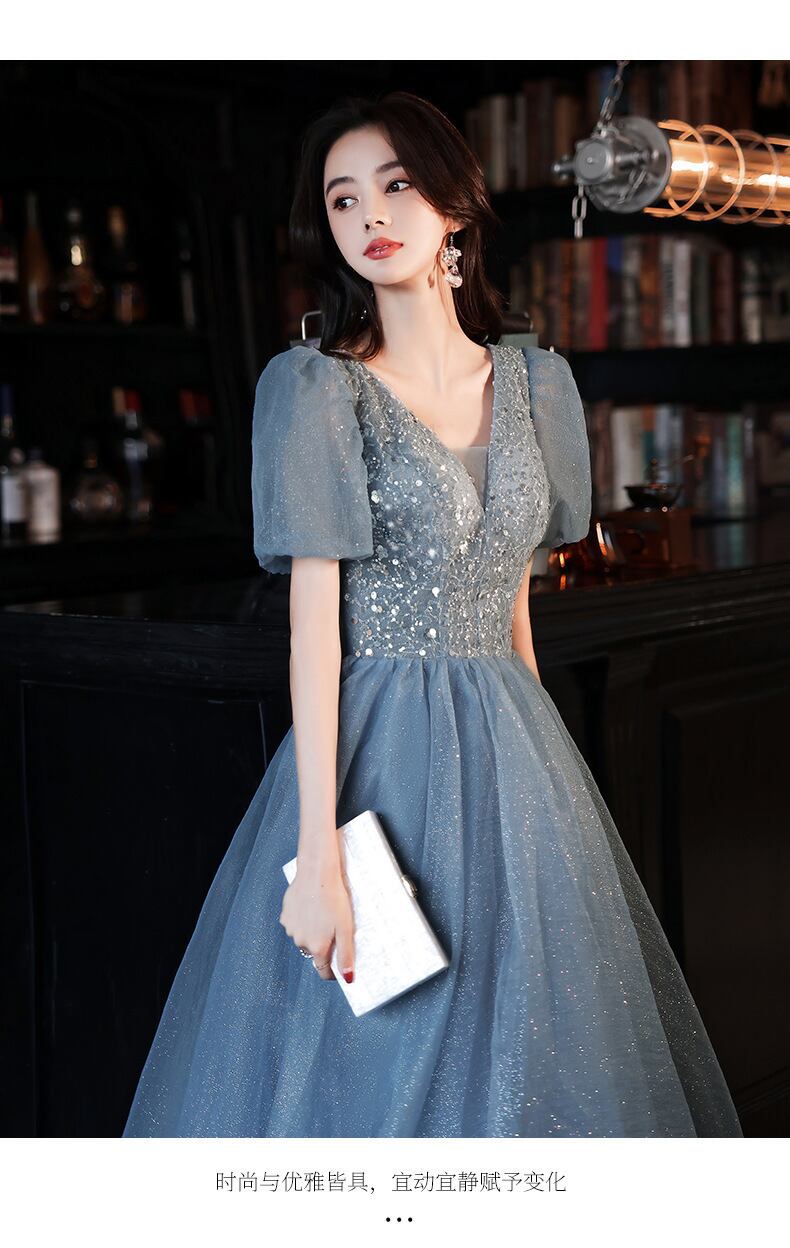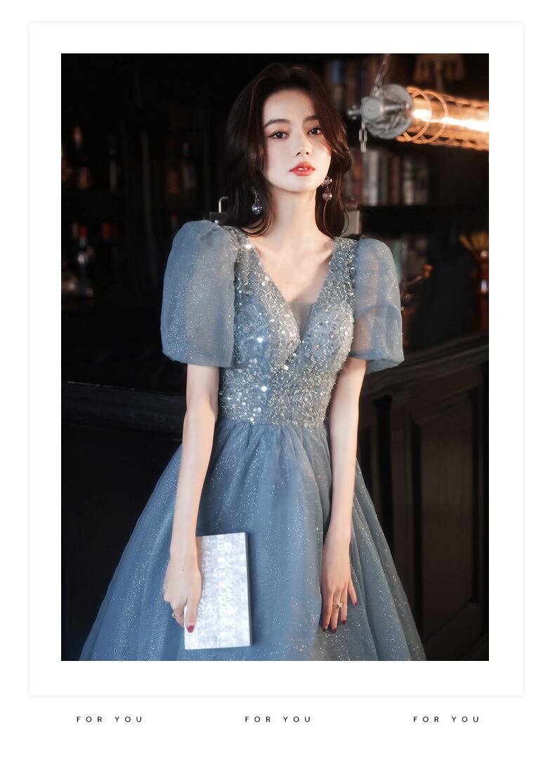 大人可愛いくすみブルーのカラードレス。