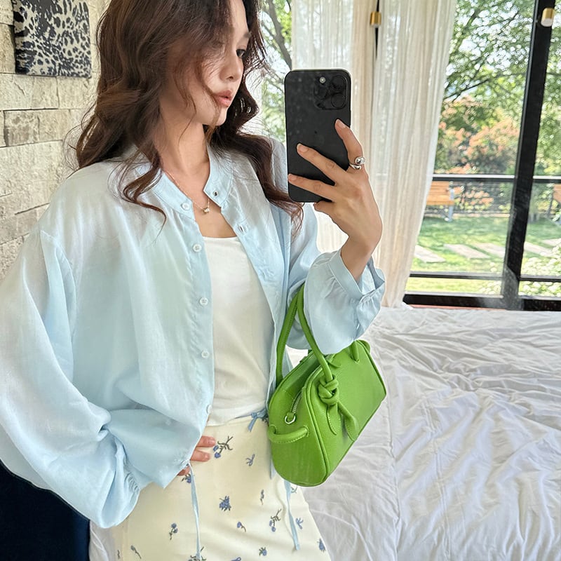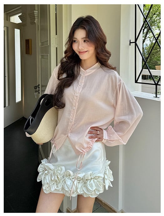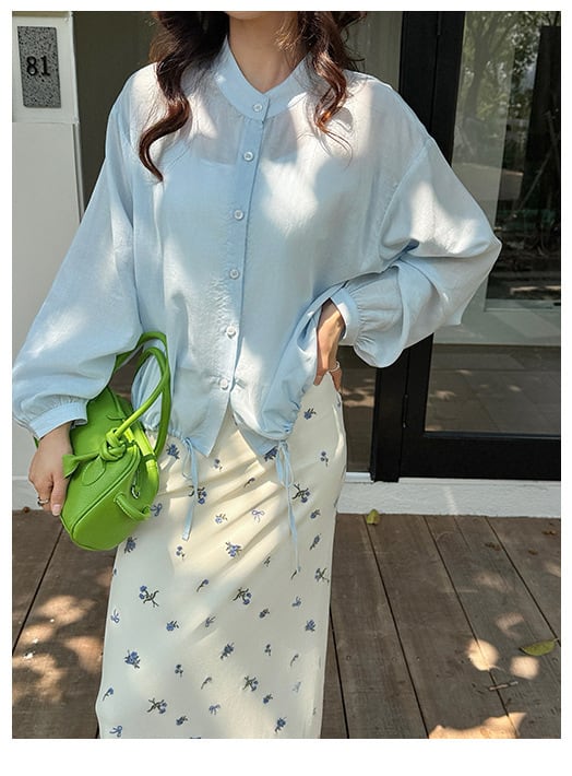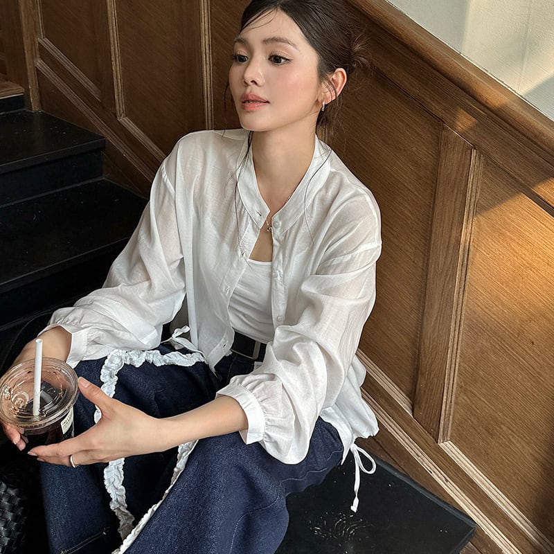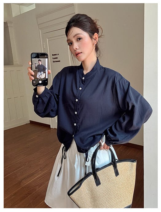 大人可愛いシンプルなバンドカラーの長袖シャツ。