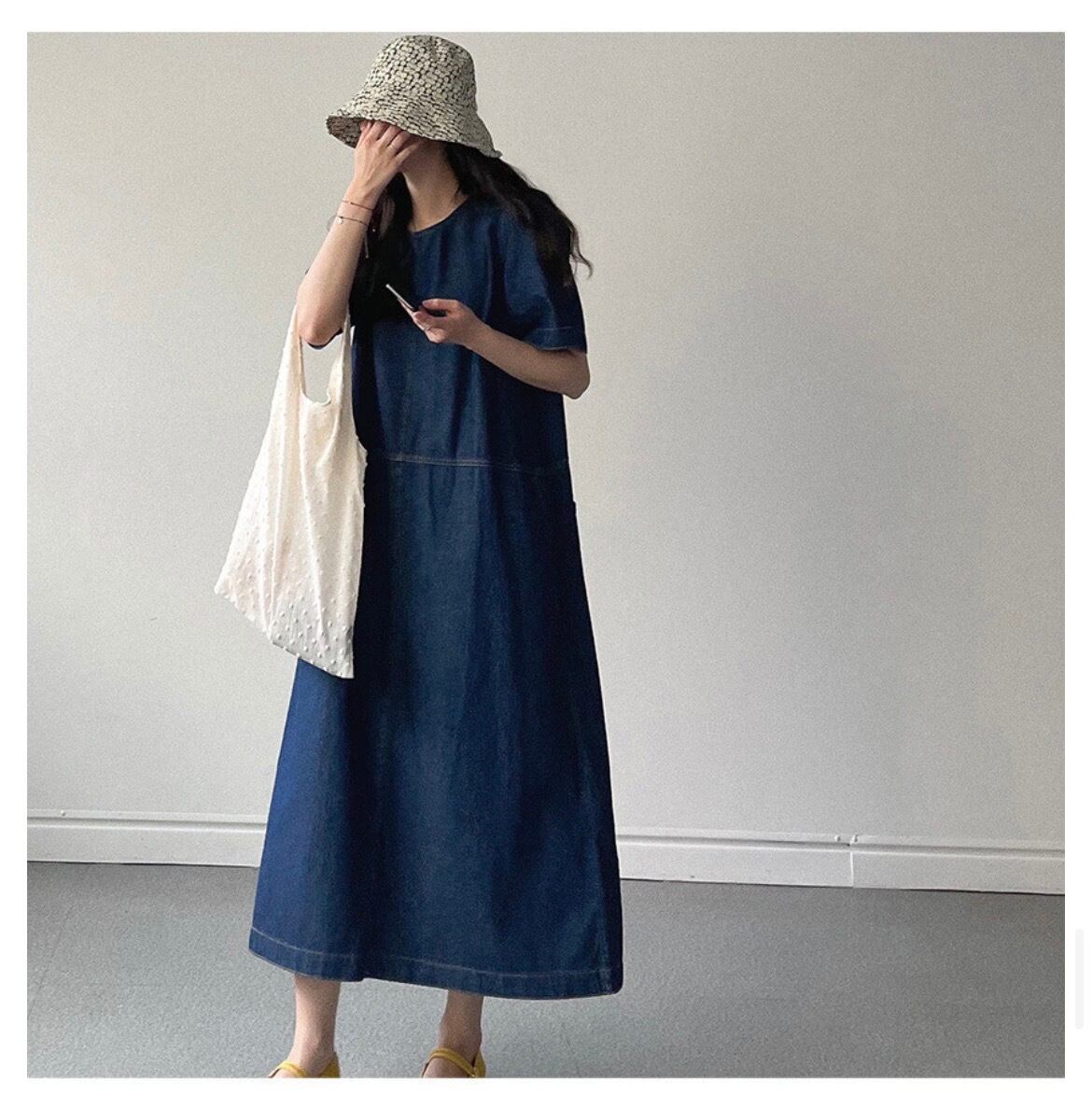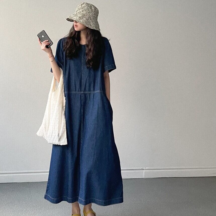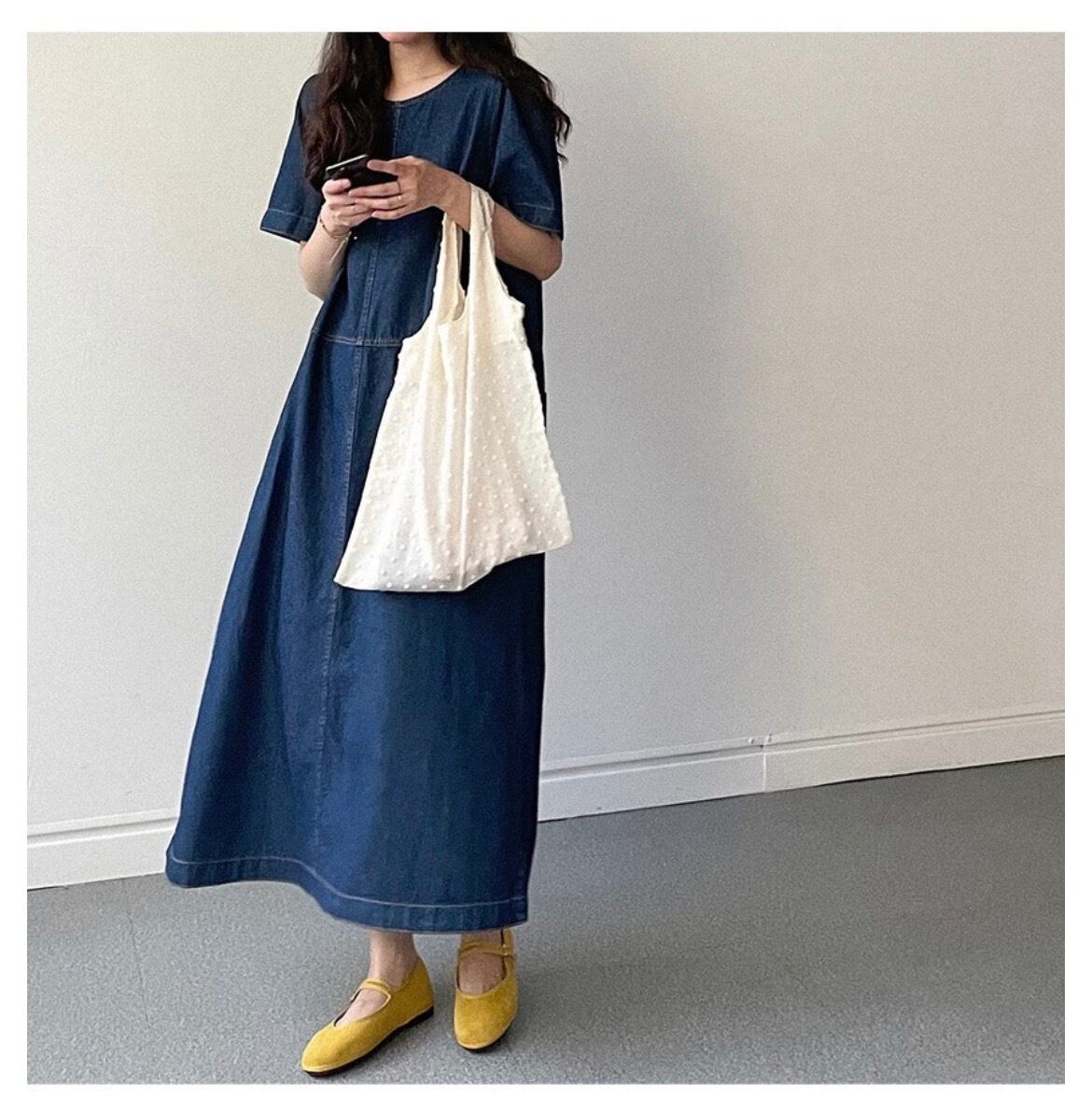 大人可愛いコットン素材のデニムワンピース。