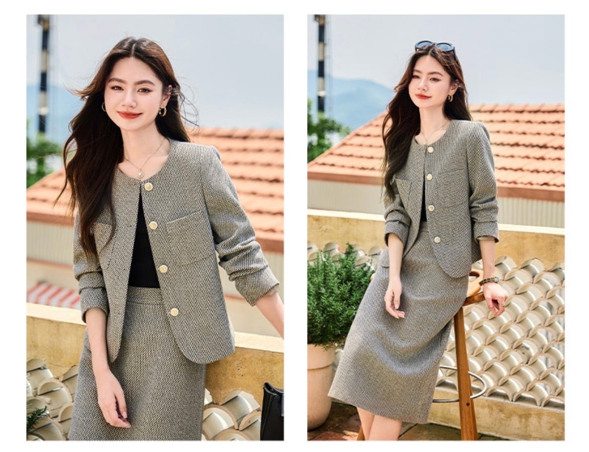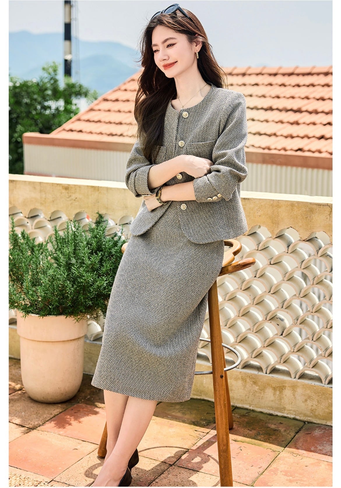 大人エレガントなスタイルを演出する、ノーカラージャケットとタイトスカートのセットアップ。