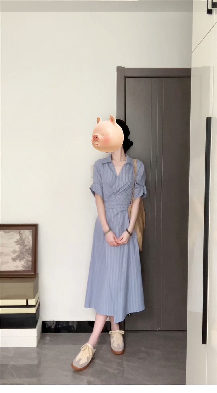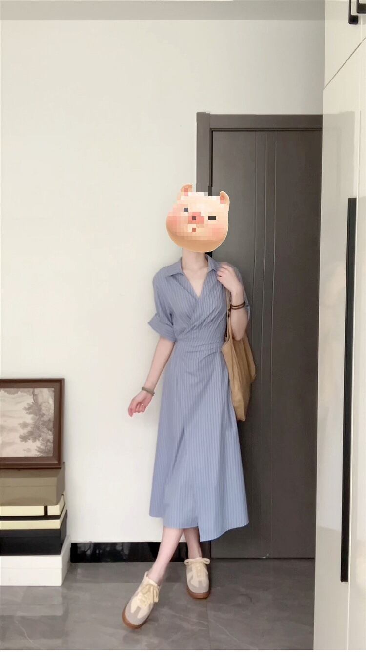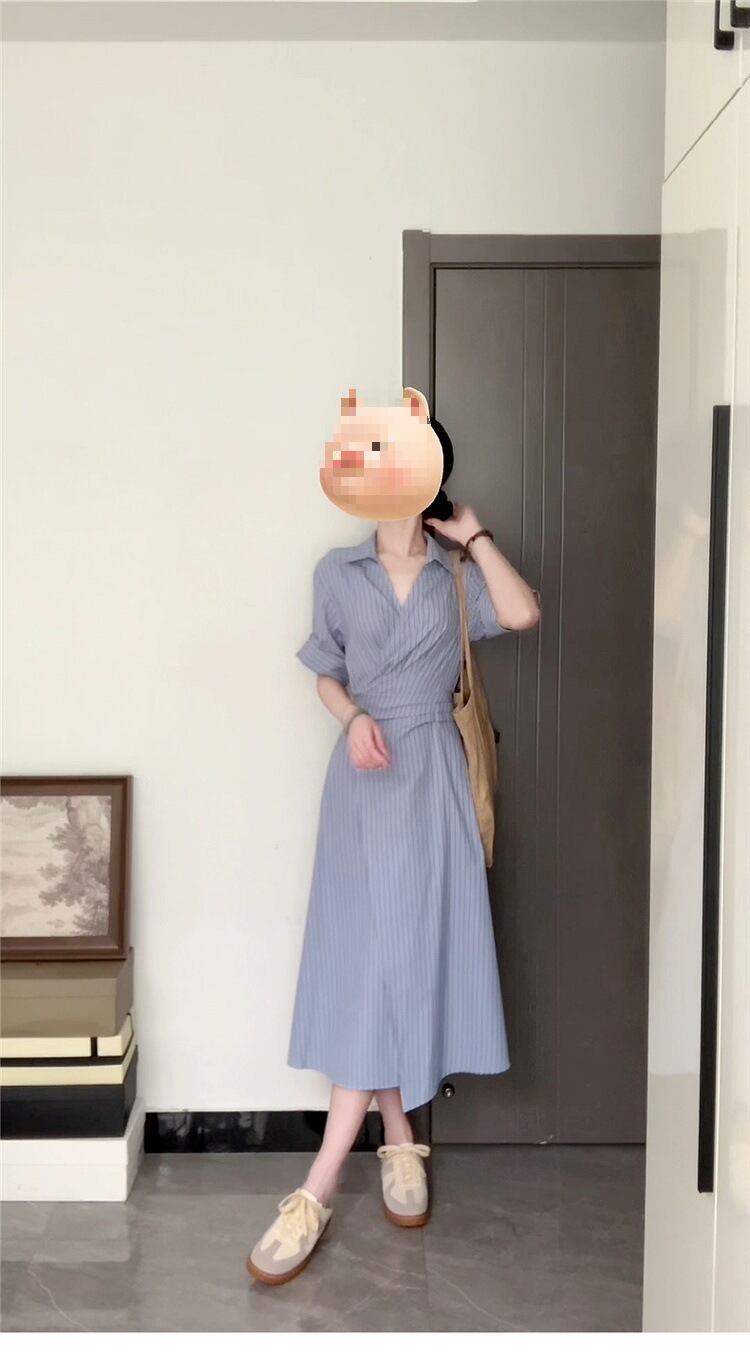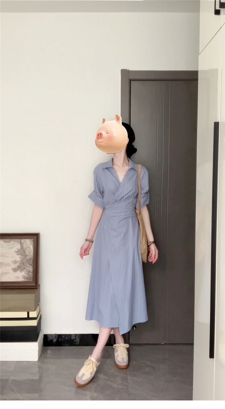 おしゃれできれいめなストライプのカシュクールデザインシャツワンピース。