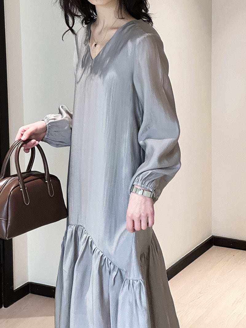 エレガントでフェミニンな印象のアシンメトリーデザインのティアードワンピース。