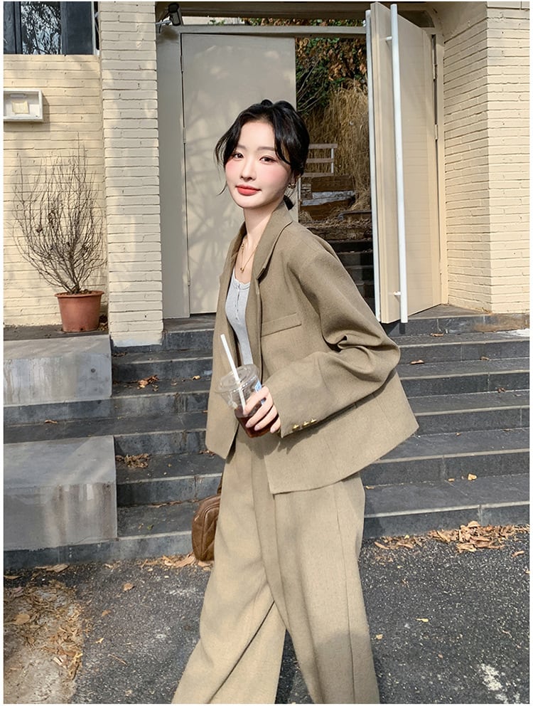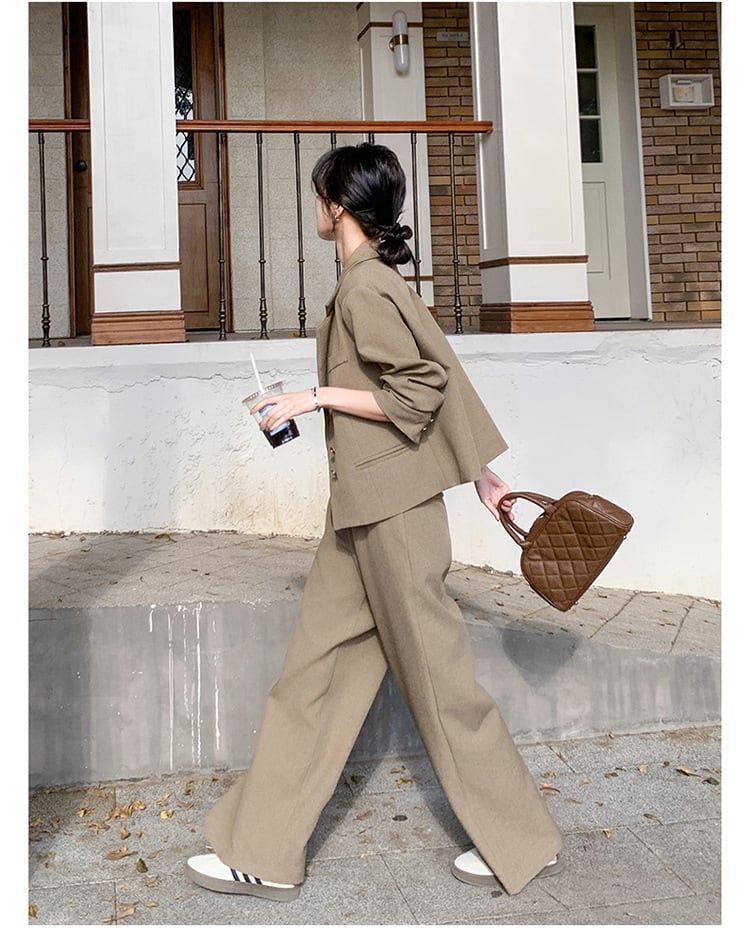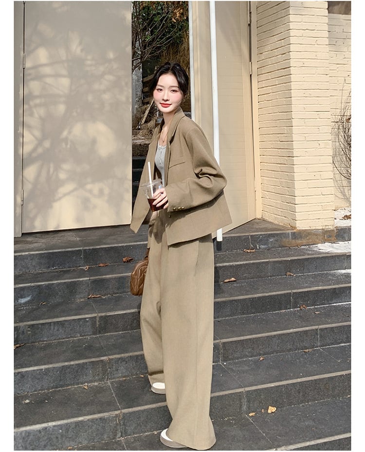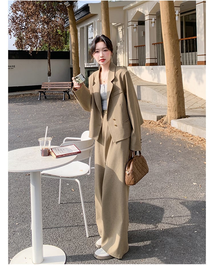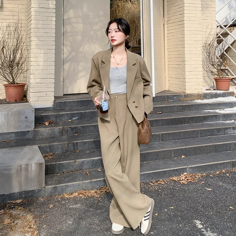 大人のおしゃれを演出するクロップド丈ジャケットとワイドパンツのスタイリッシュなセットアップスーツ。