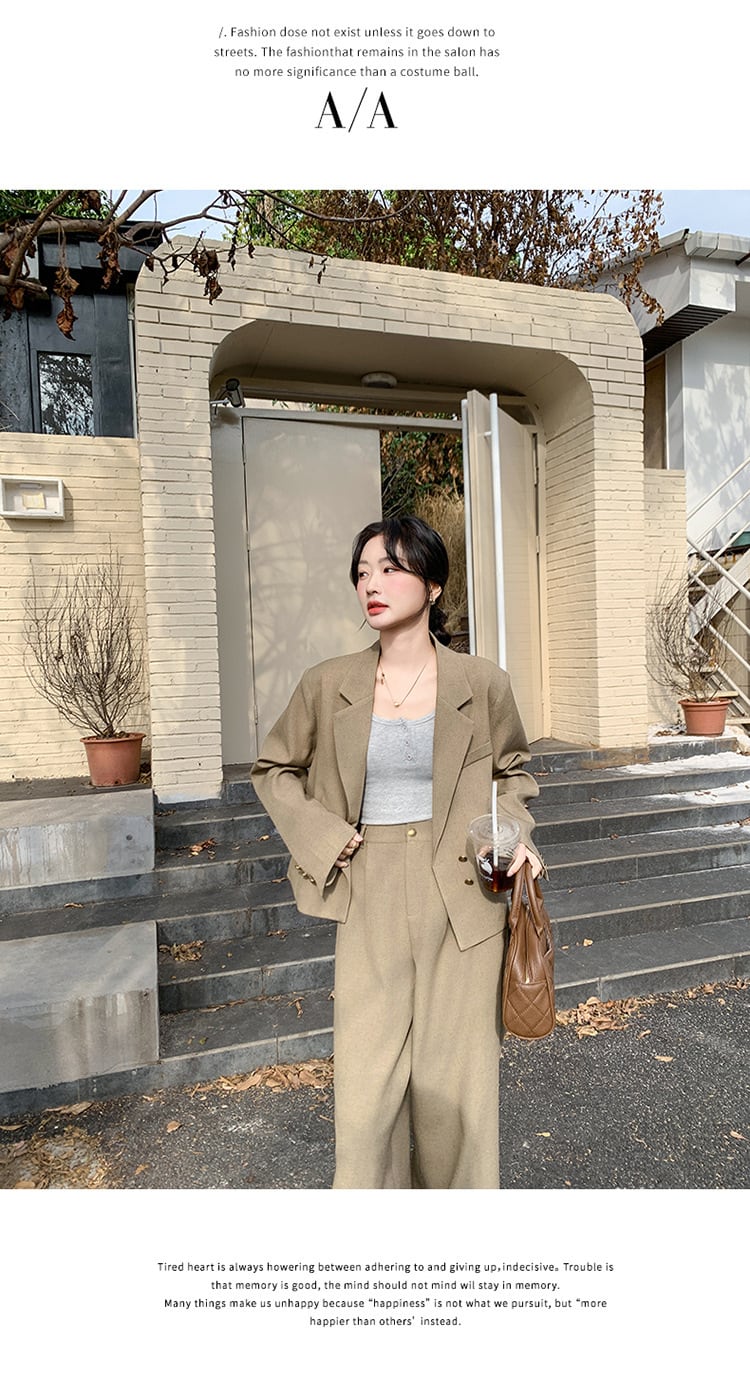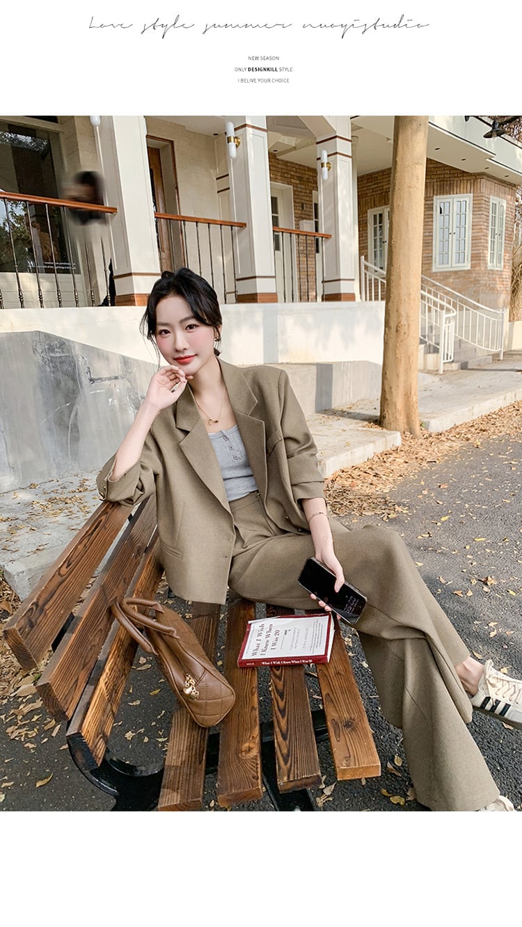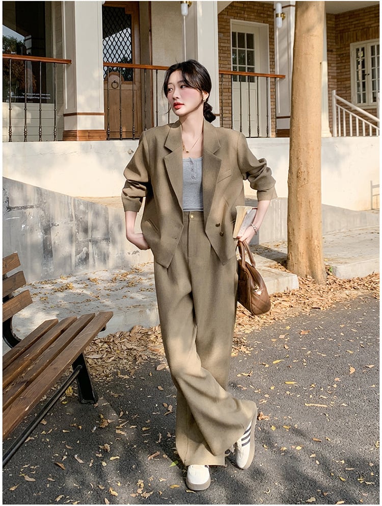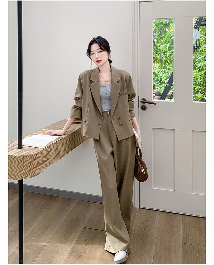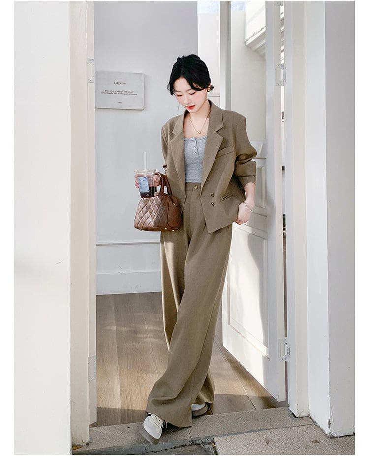 大人のおしゃれを演出するクロップド丈ジャケットとワイドパンツのスタイリッシュなセットアップスーツ。