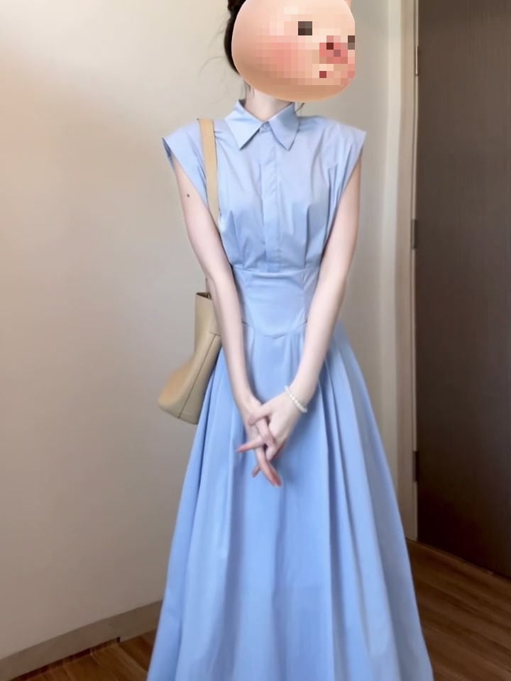 大人可愛い清涼感あふれるブルーカラーのシャツワンピース。