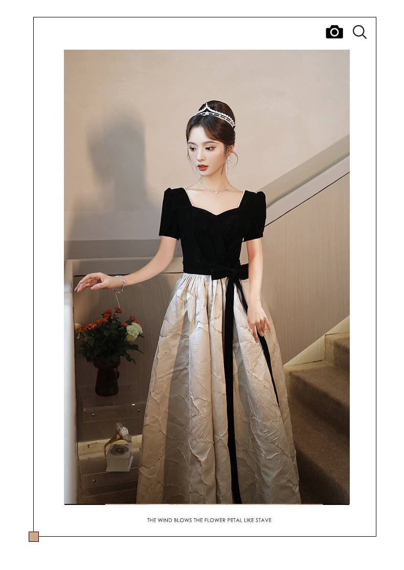エレガントなバイカラーのジャガード素材を使用したパーティードレス。