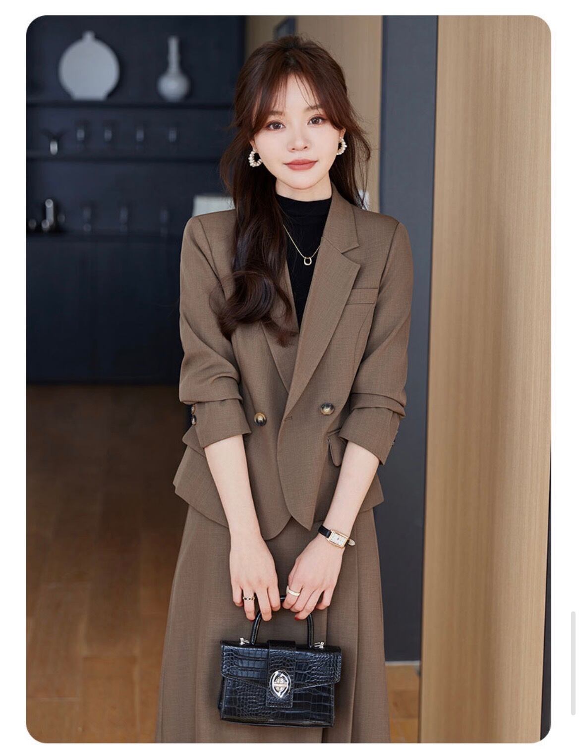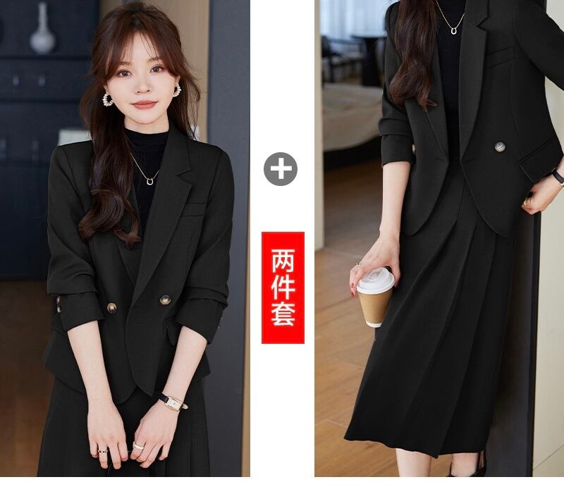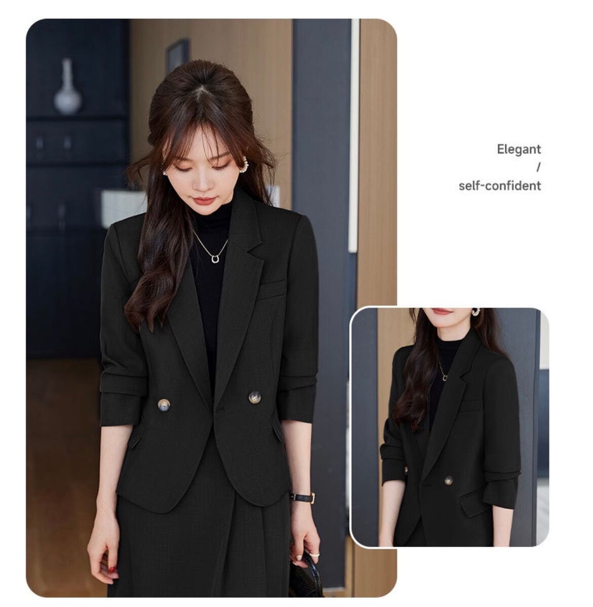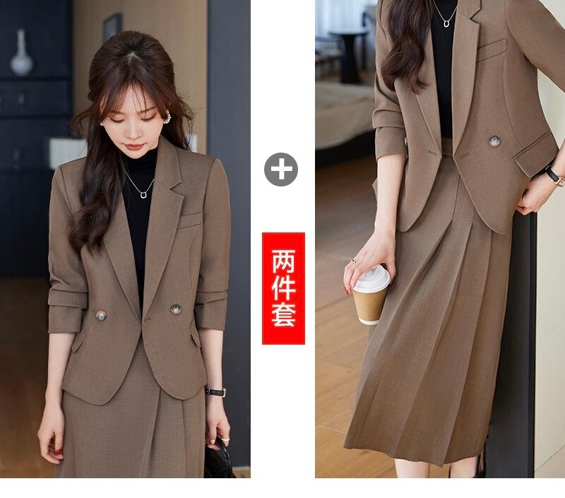 テーラードジャケットとボックスプリーツスカートのセットは、シンプルながらも上品で優雅な印象を与えます。