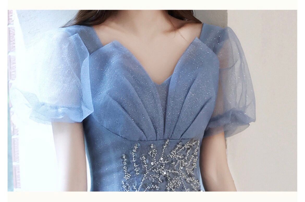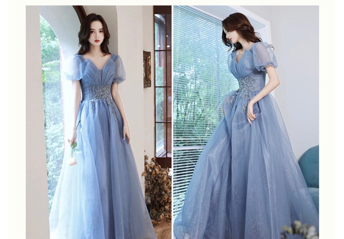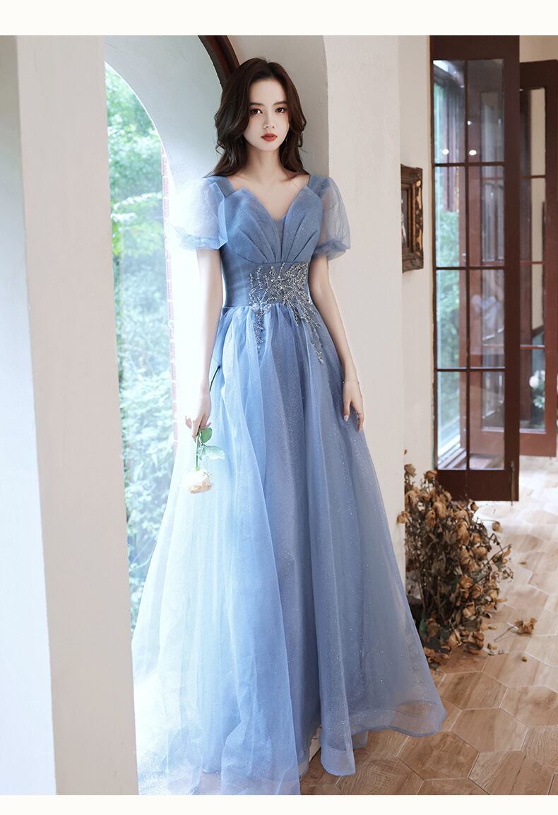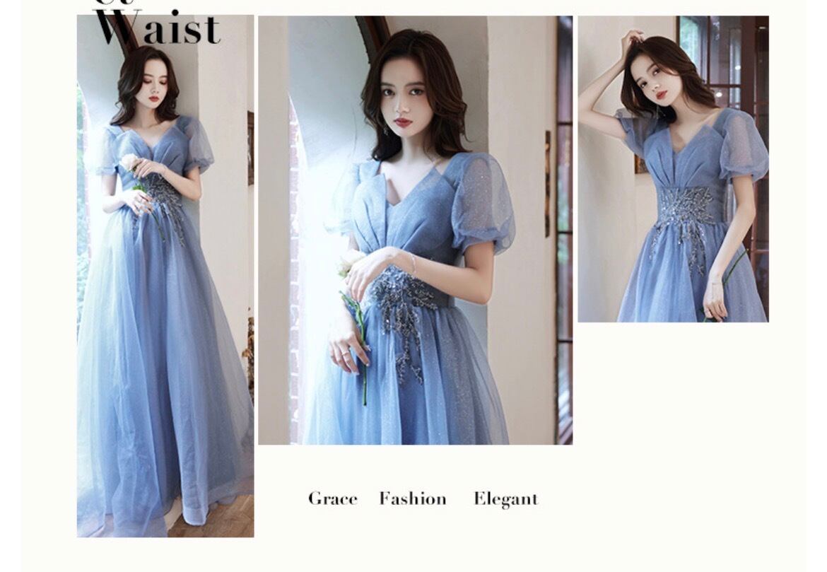 大人可愛いくすみブルーのカラードレス。