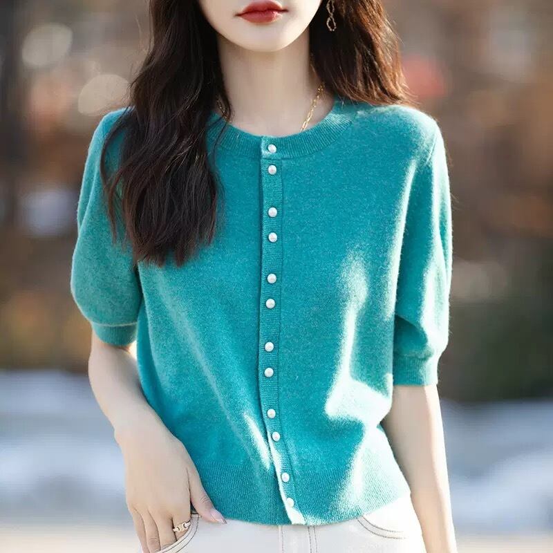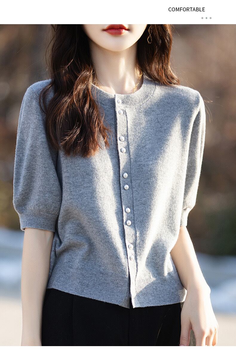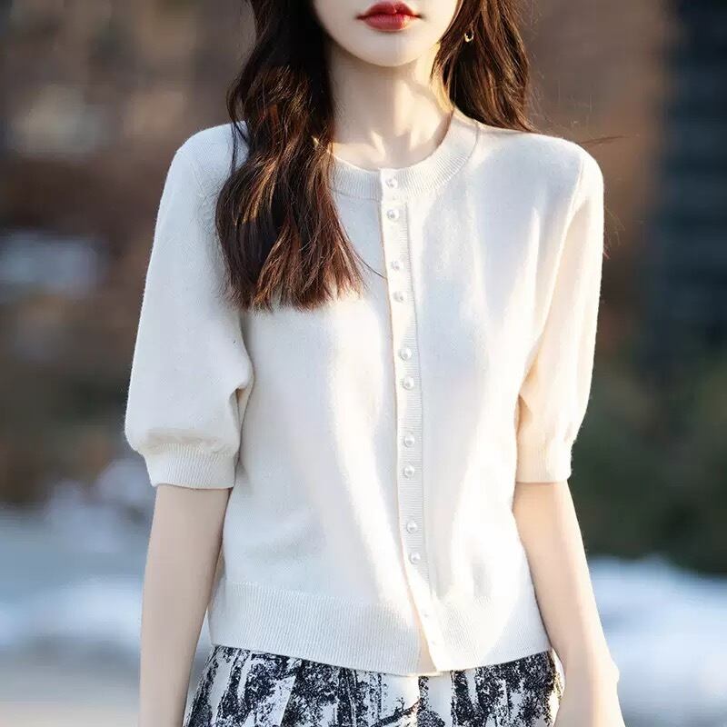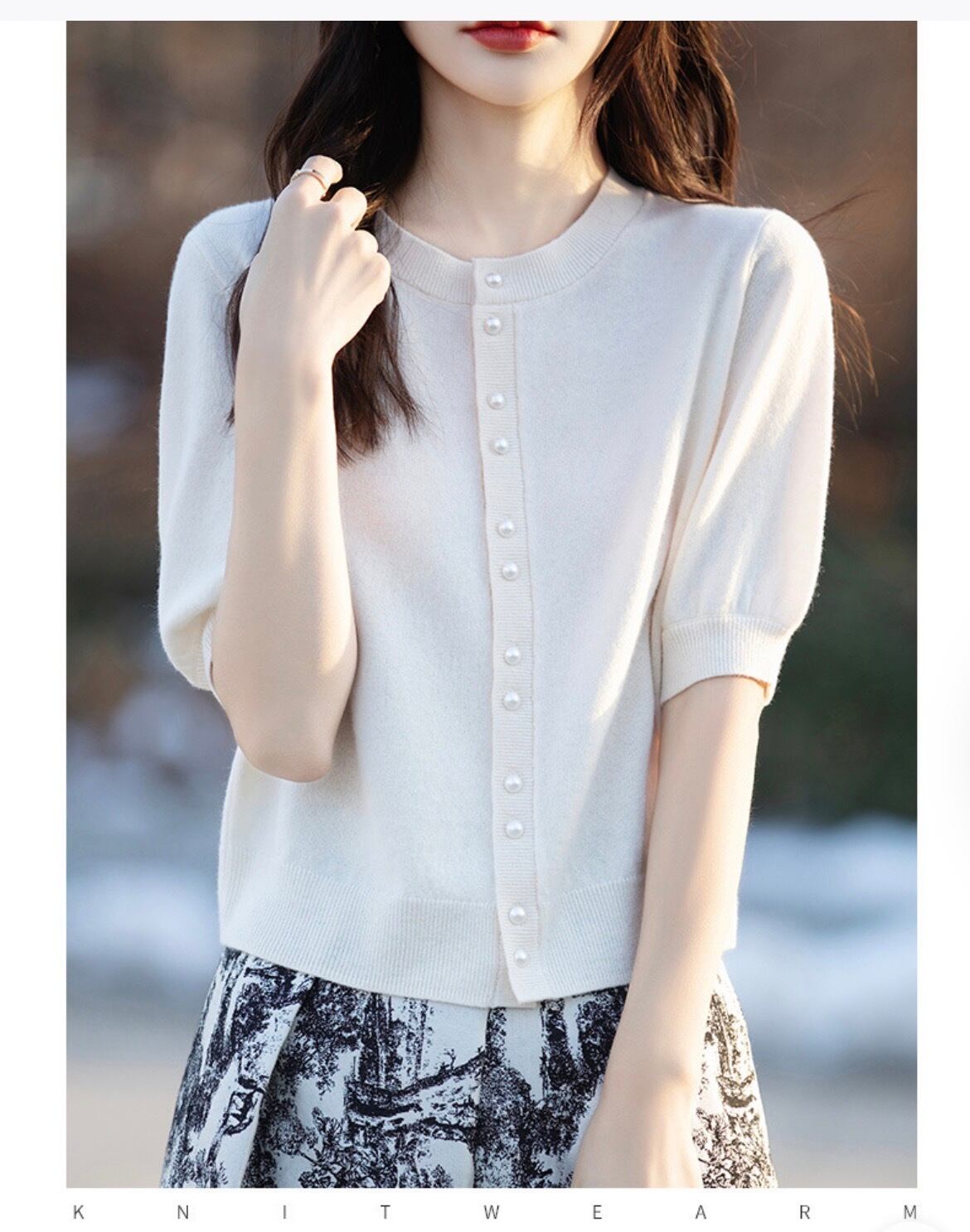五分袖で、ころんとしたシルエットが女性らしさを引き立てる。