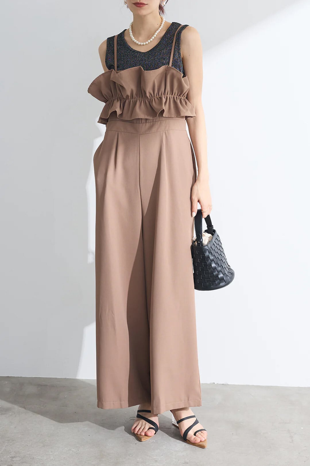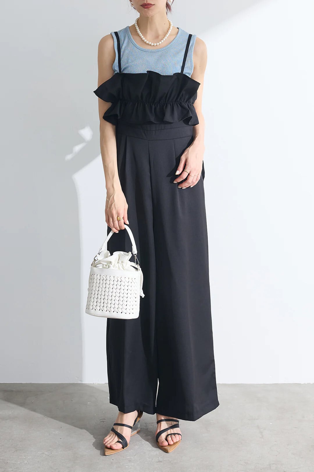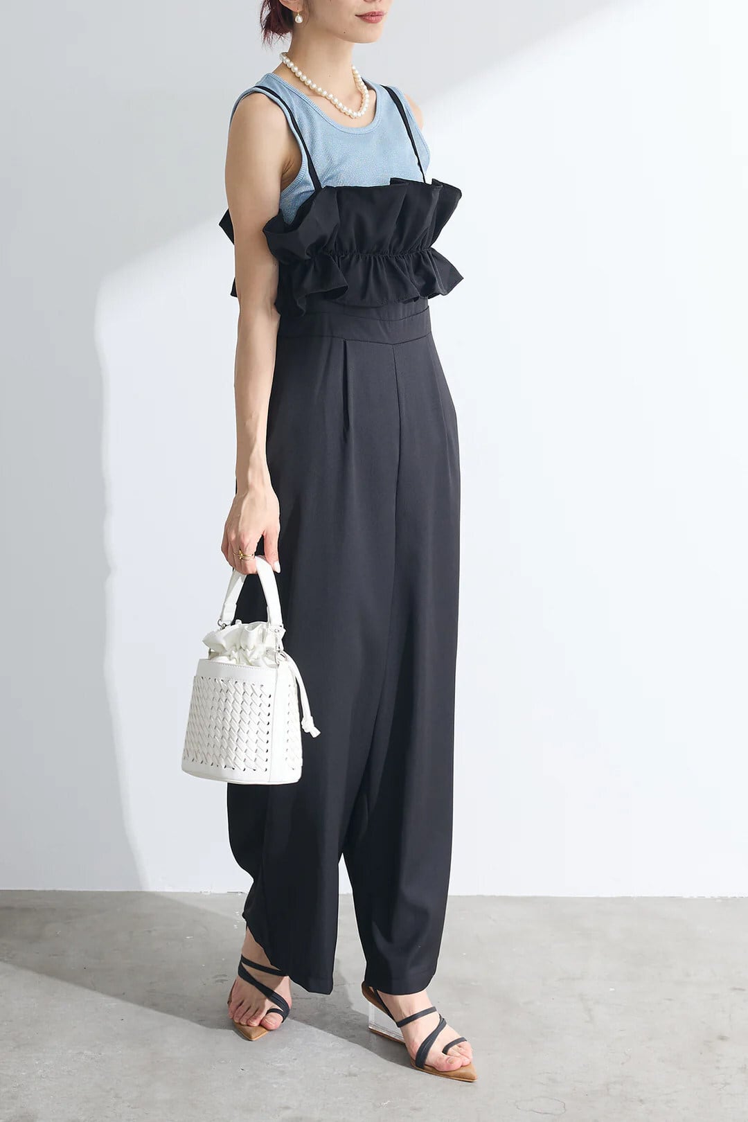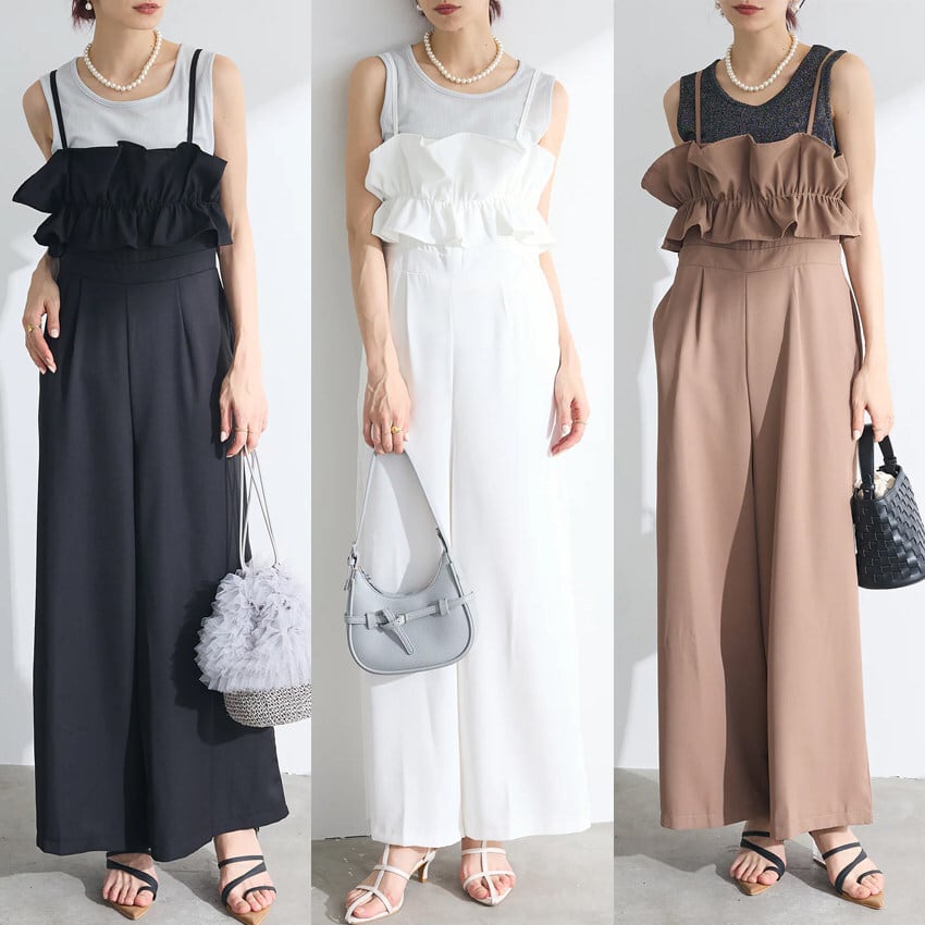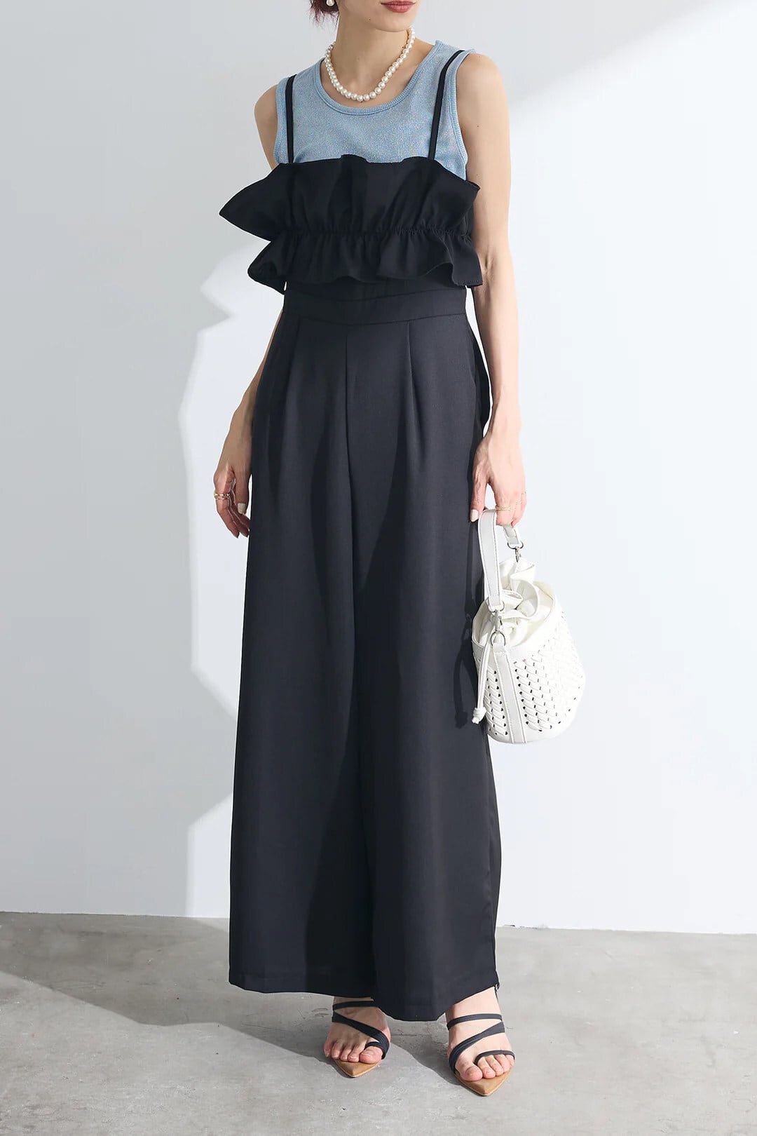バスト部分に施されたフリルが胸元を上手にカモフラージュし、女性らしさを引き立てます。ハイウェストのシルエットは足長効果もバツグン!