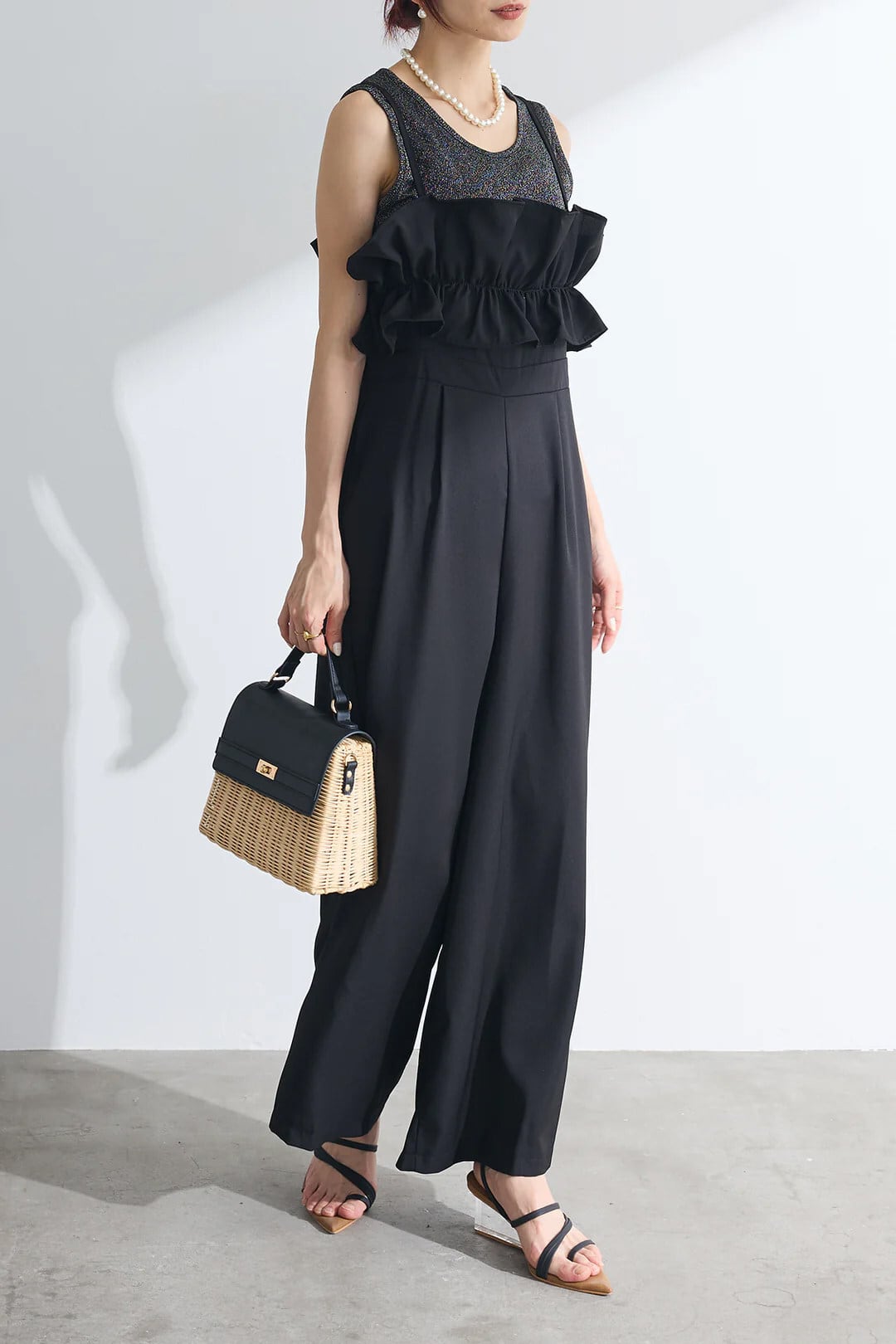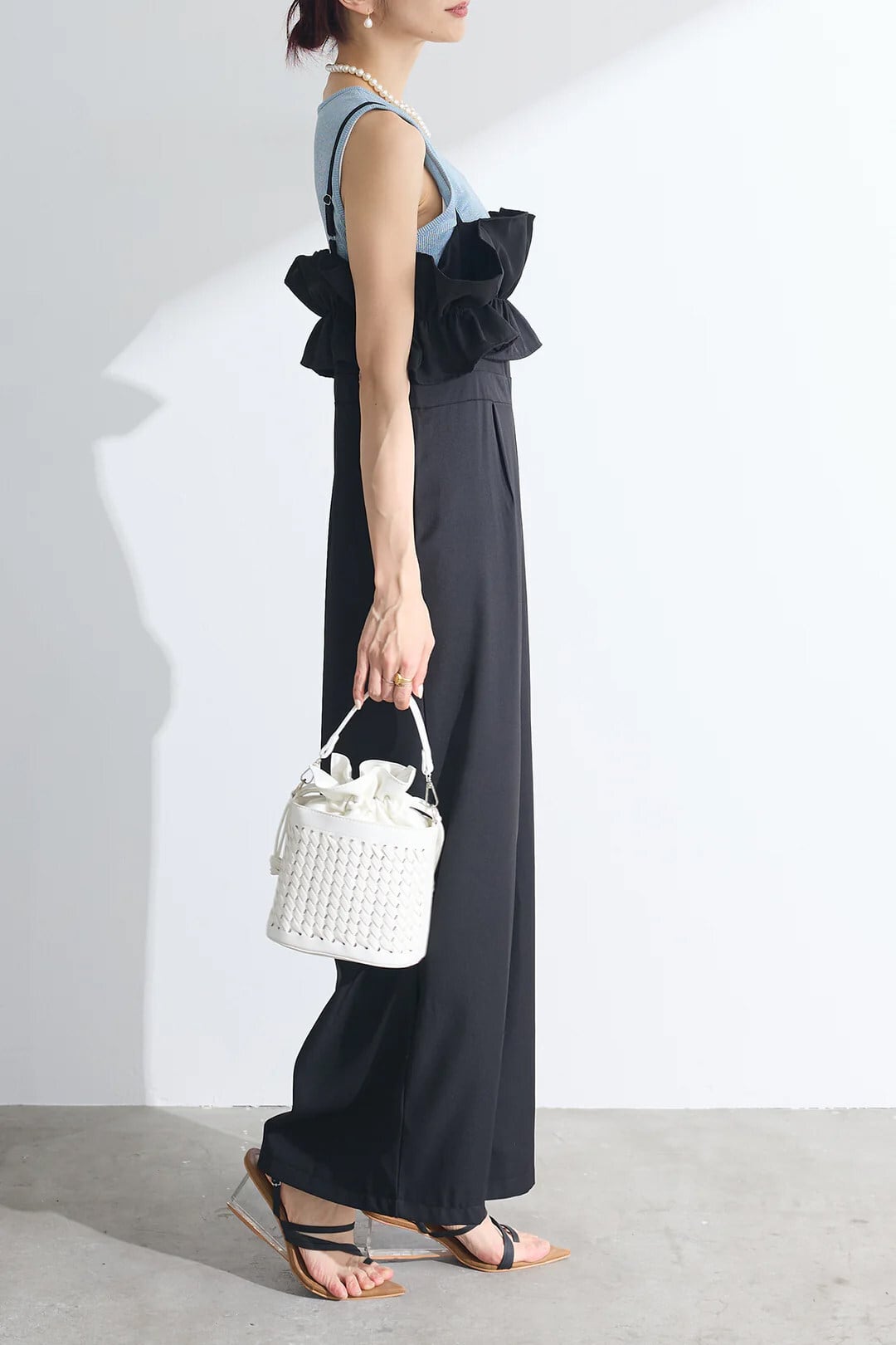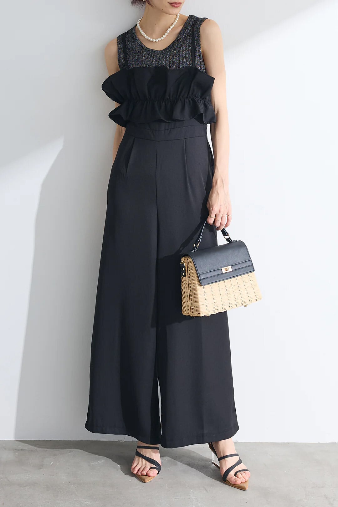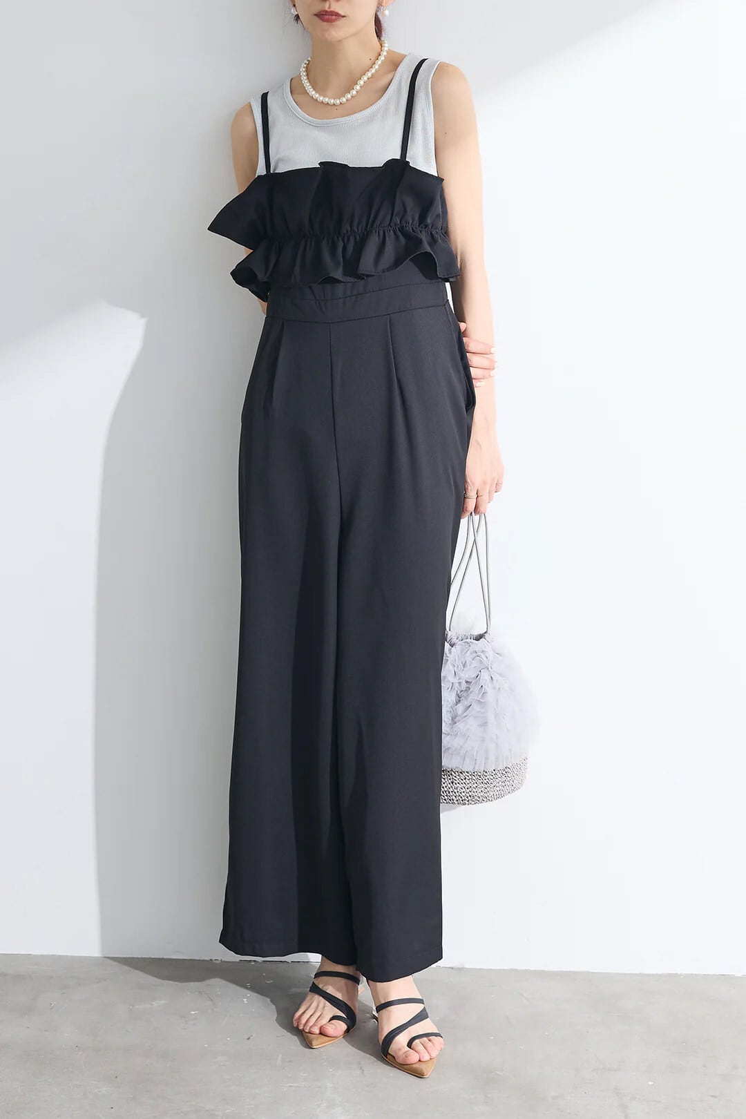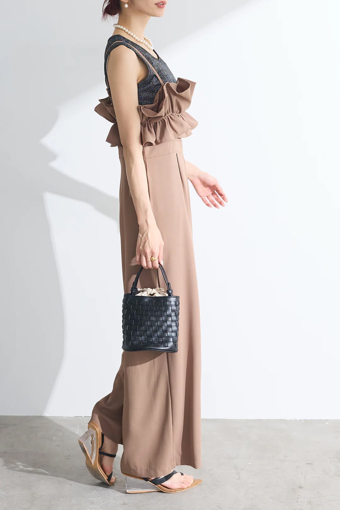 バスト部分に施されたフリルが胸元を上手にカモフラージュし、女性らしさを引き立てます。ハイウェストのシルエットは足長効果もバツグン!