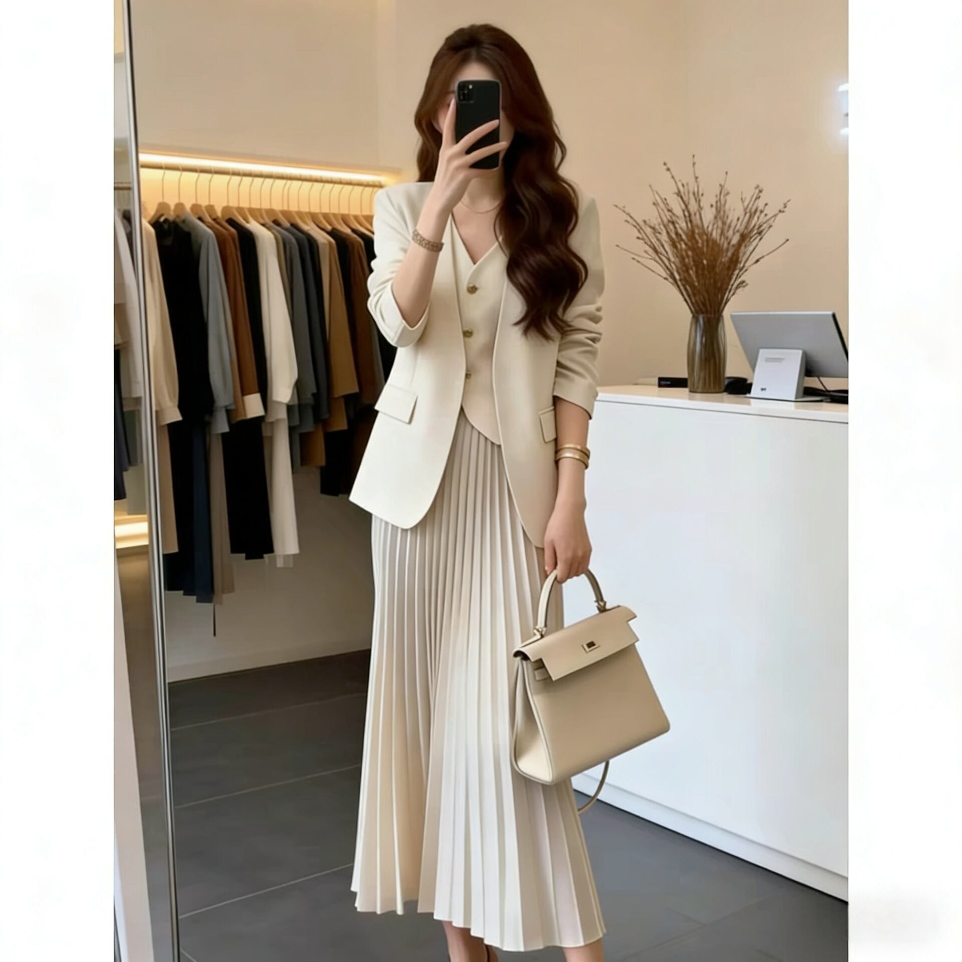 洗練されたノーカラージャケット、上品なジレ、そしてワイドパンツまたはプリーツスカートの組み合わせは、シーンを選ばず、いつでもあなたを引き立てます✨