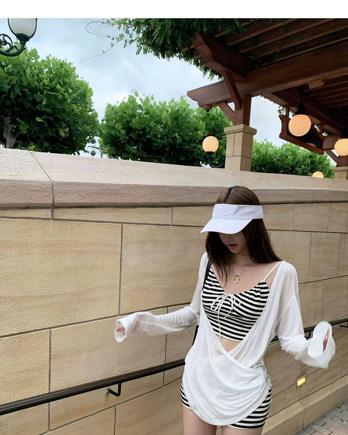 ラッシュガード付きで体型カバーをしつつ、爽やかなストライプ柄が魅力的な一点。