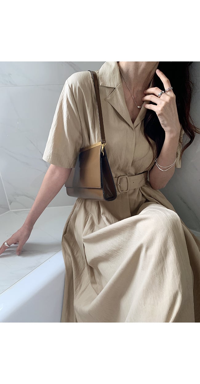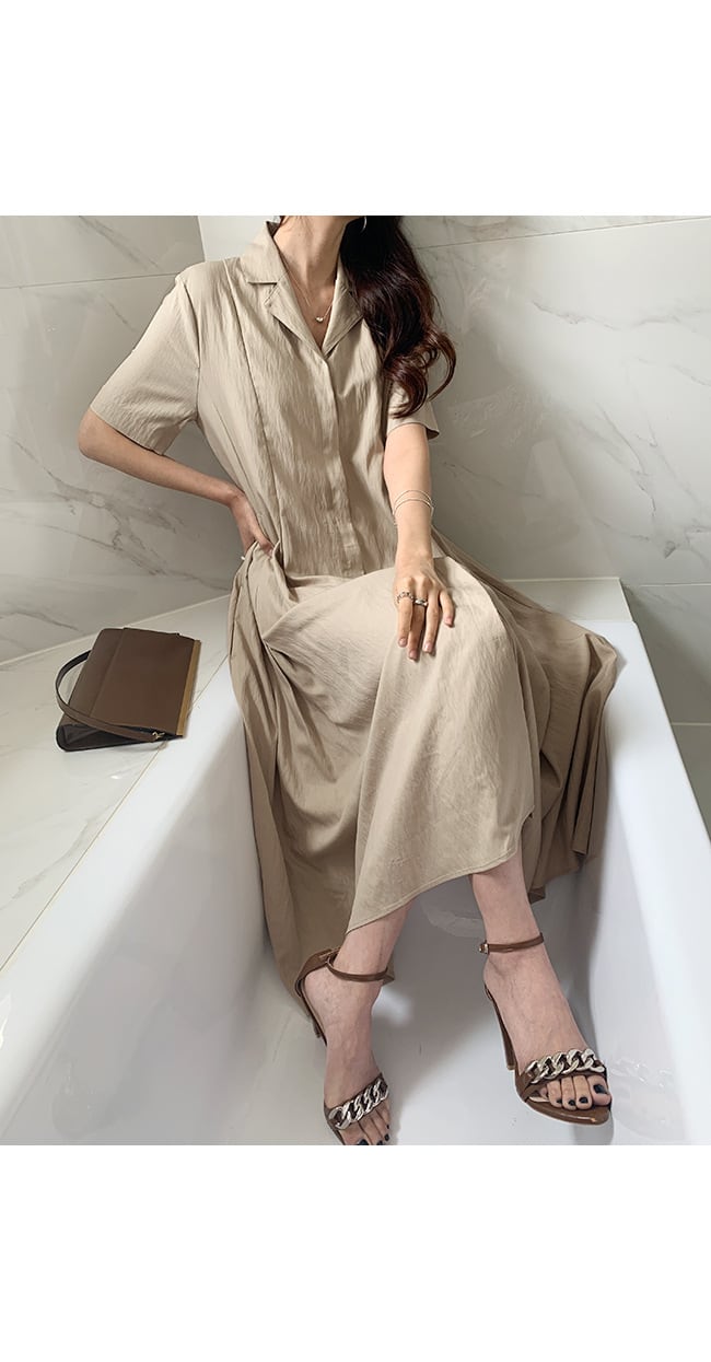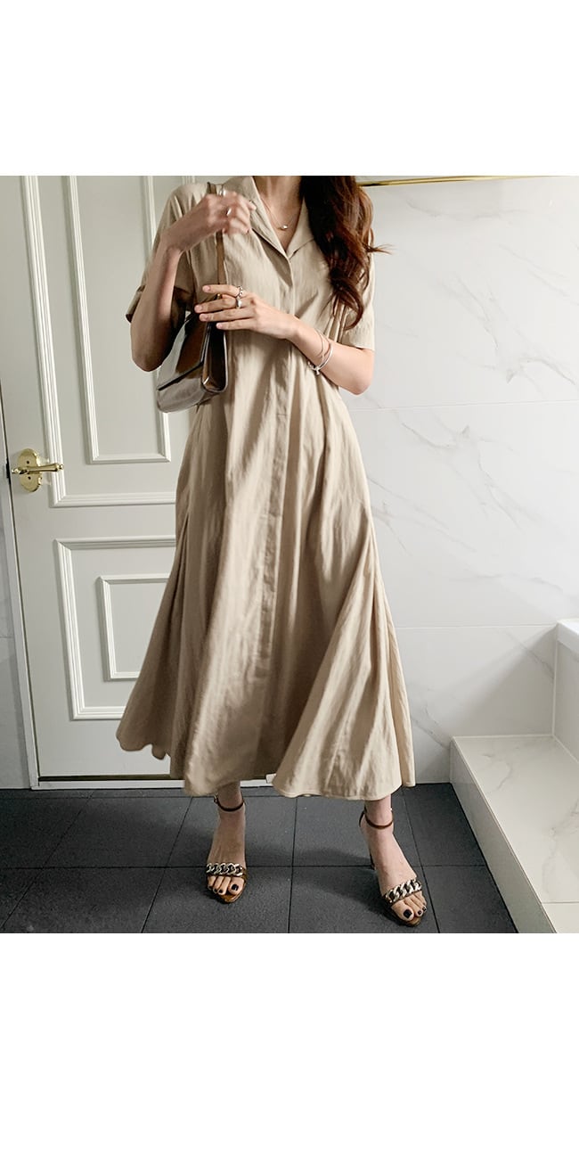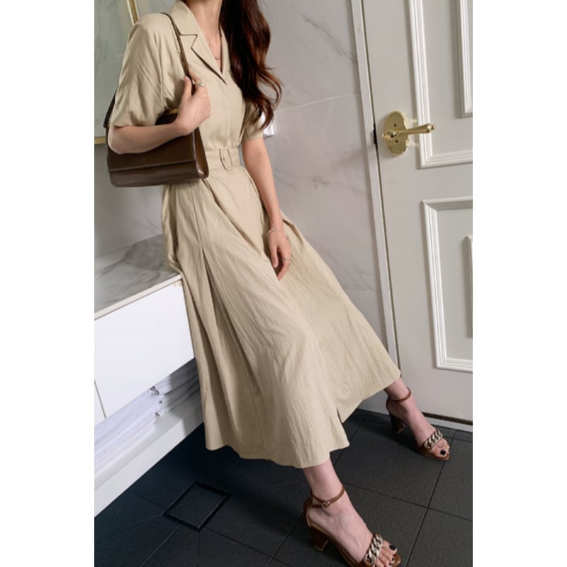 このベージュカラーのワンピースは、春から秋までの季節で活躍し、おしゃれでエレガントな印象を与えます。