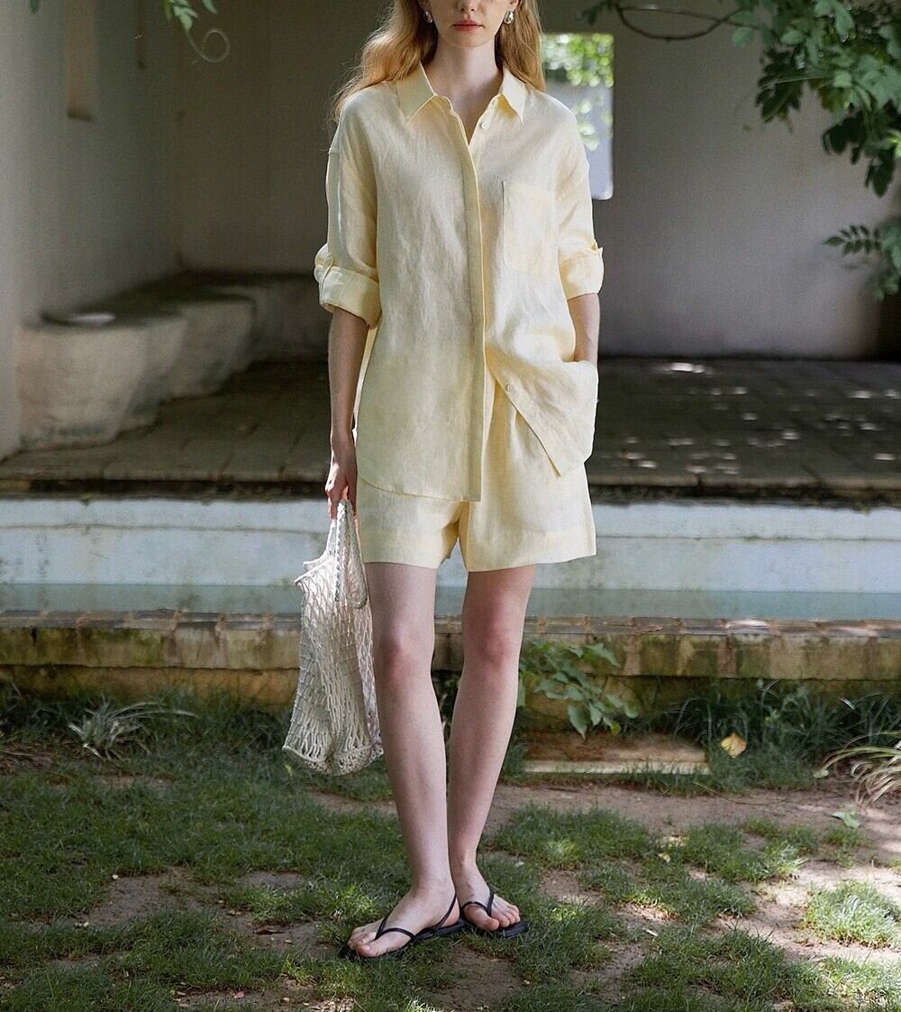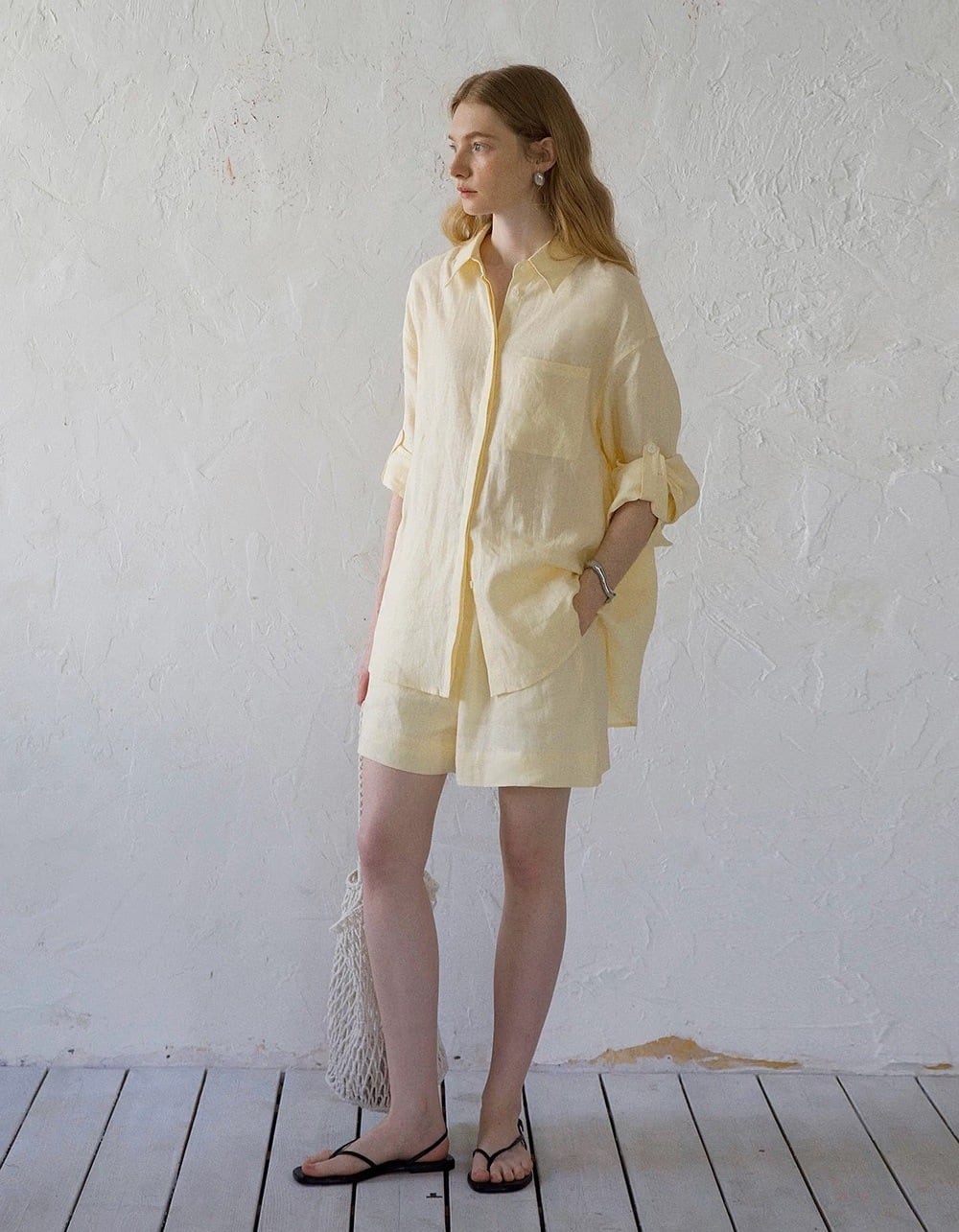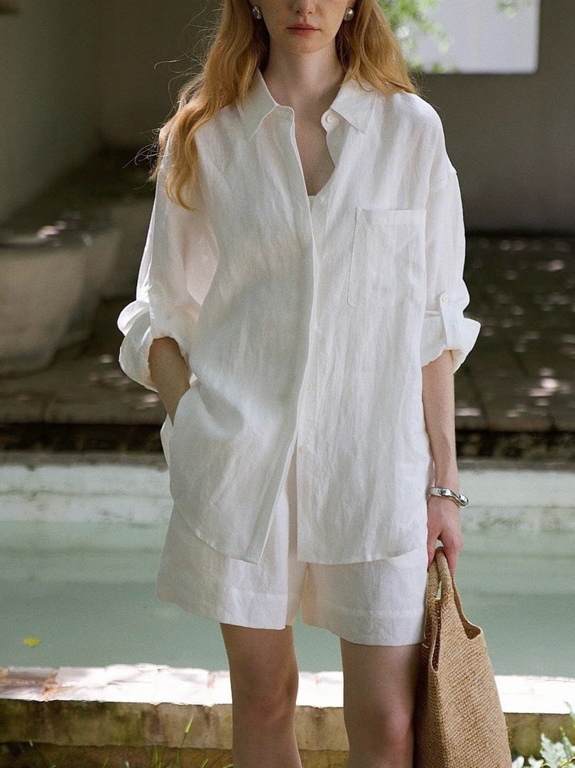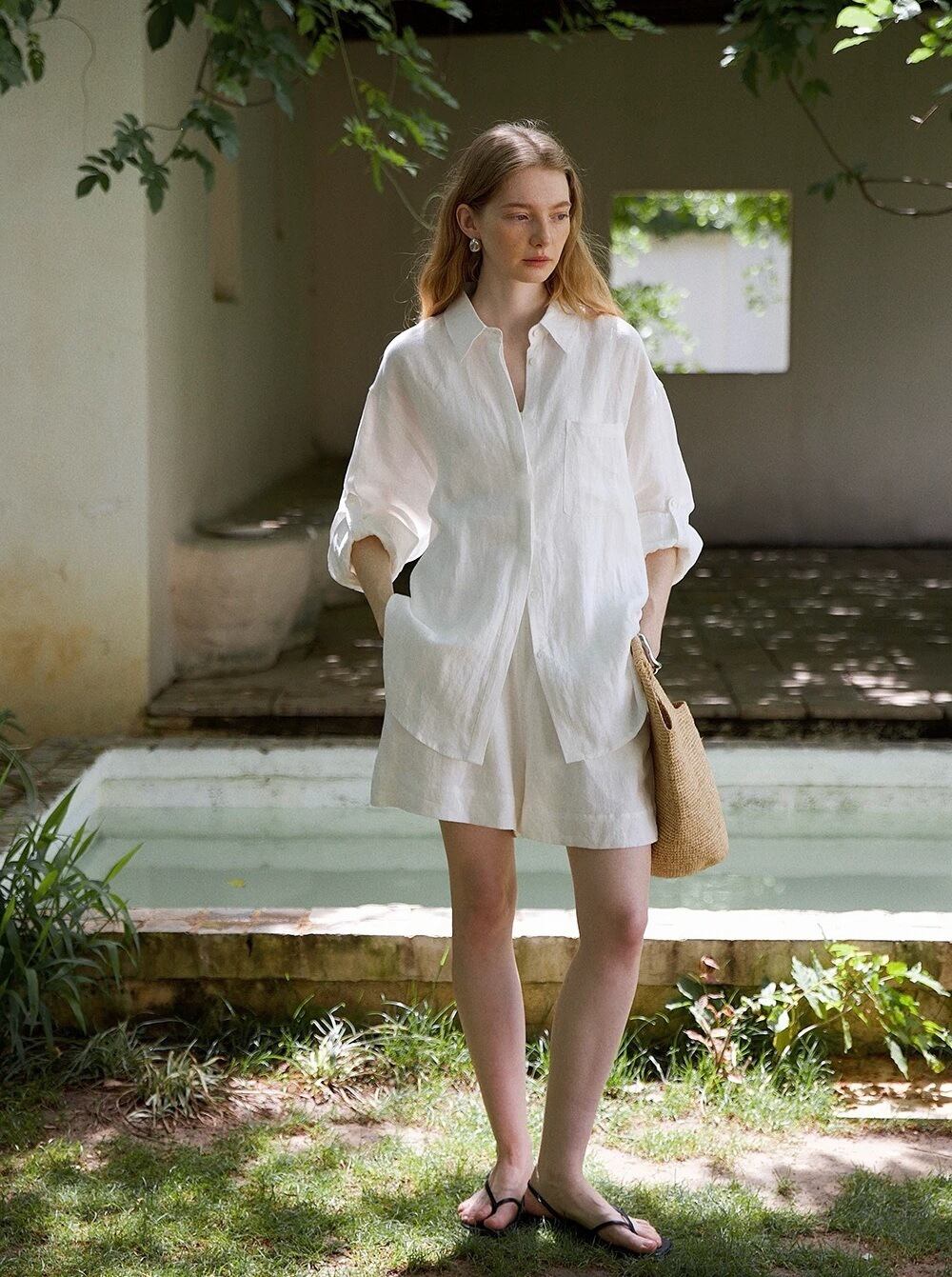 このシンプルなシャツとショートパンツのコンビネーションは、春・夏・秋のマルチシーズンで大活躍間違いなしです。