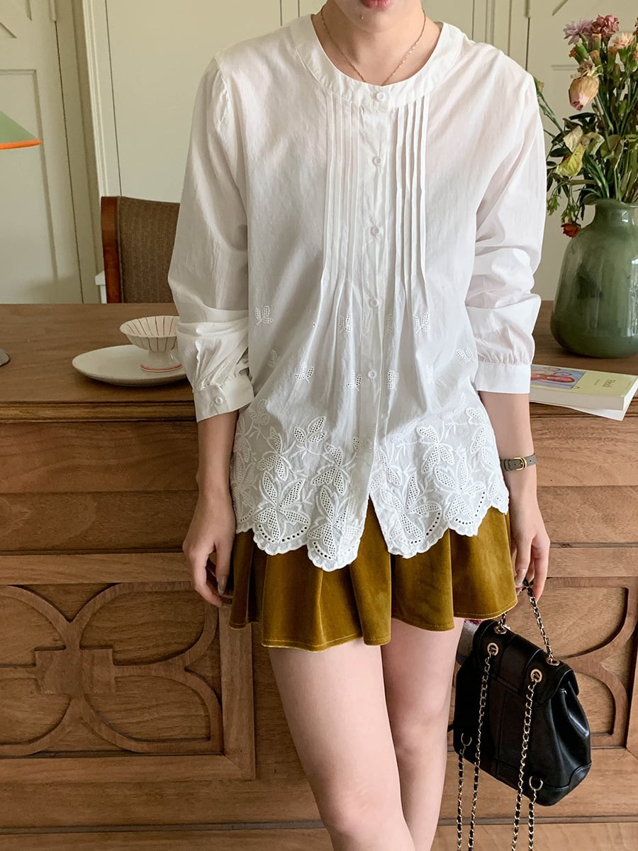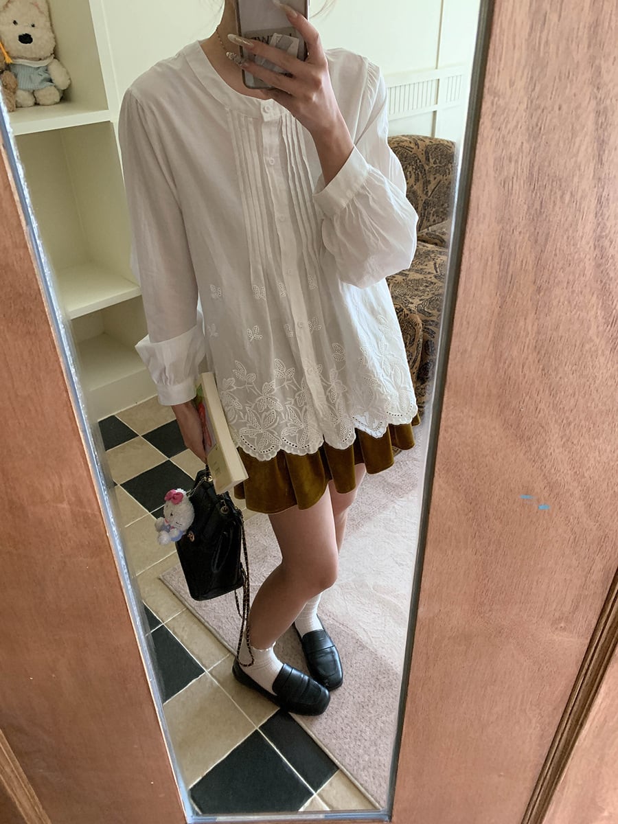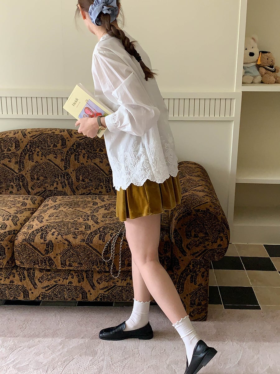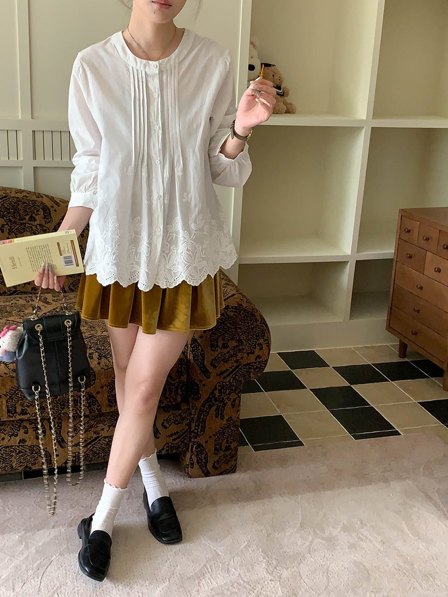 裾に施された可愛らしい刺繍が、シンプルながらも特別な印象を与えます。