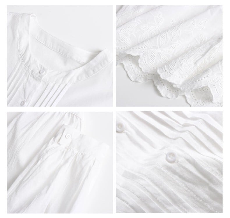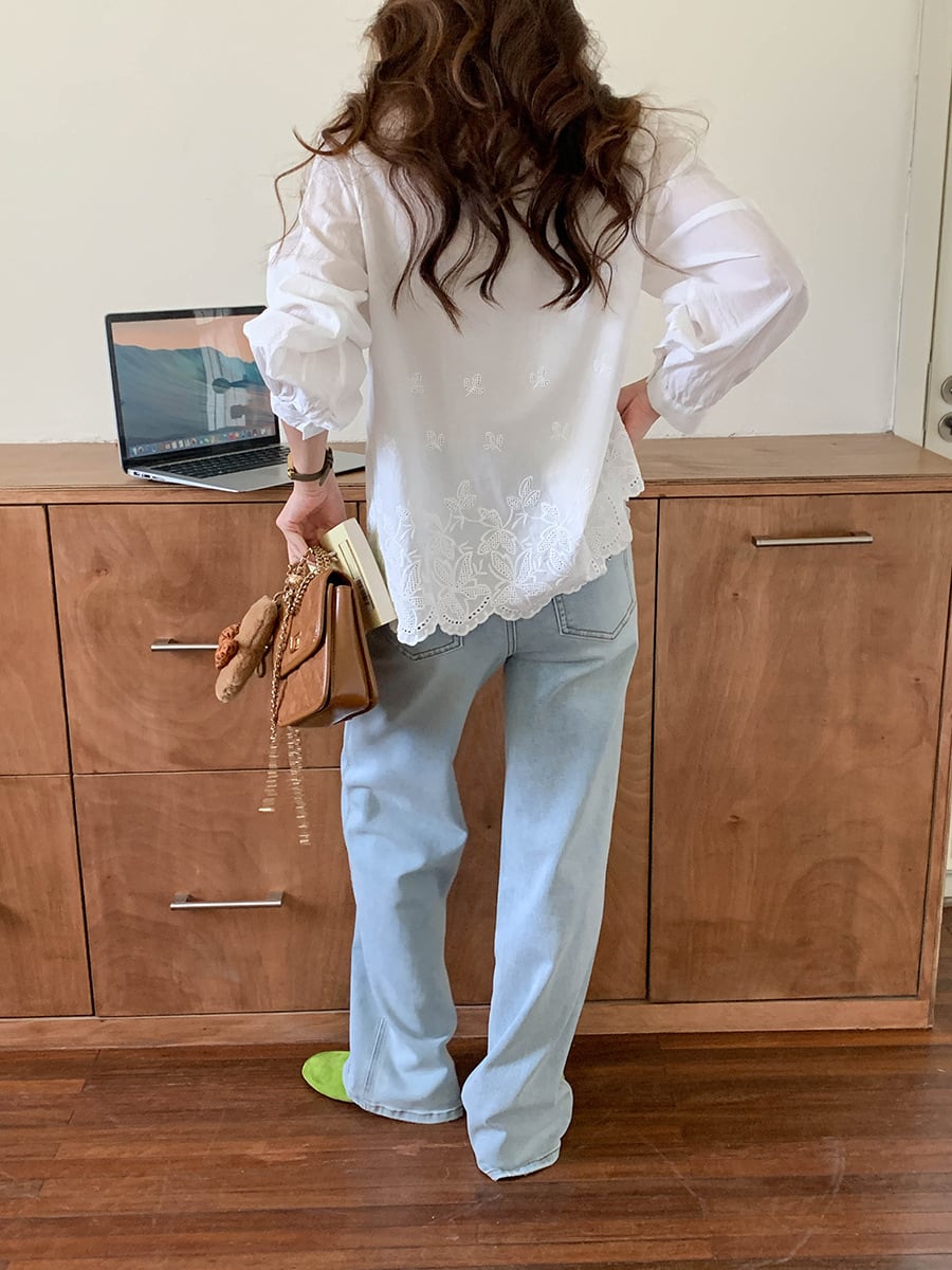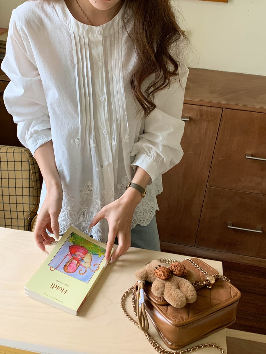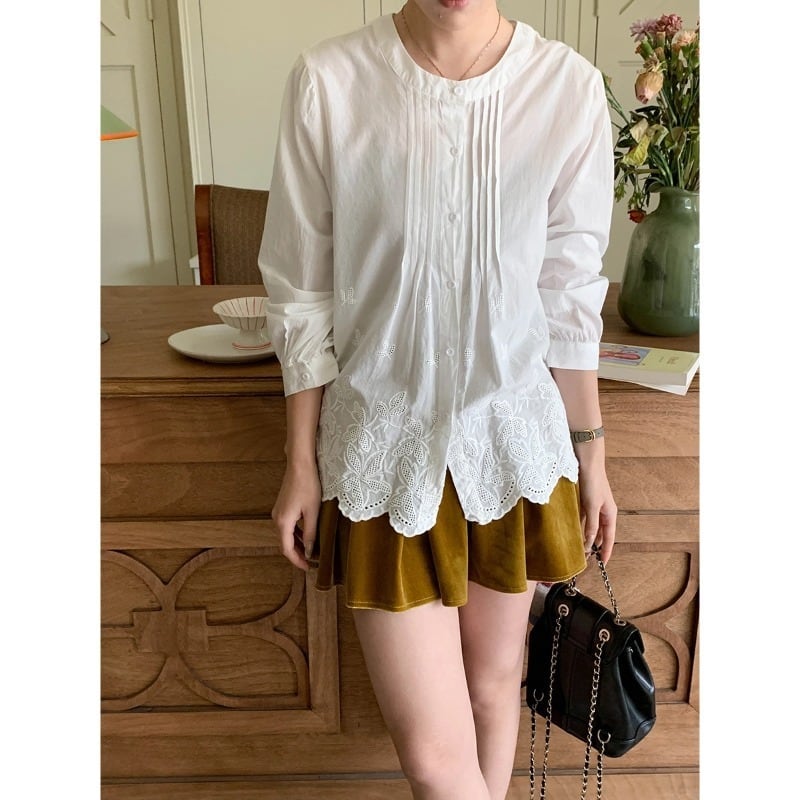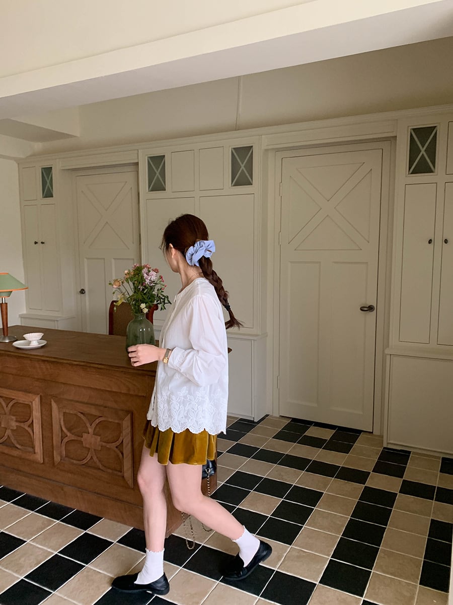 裾に施された可愛らしい刺繍が、シンプルながらも特別な印象を与えます。