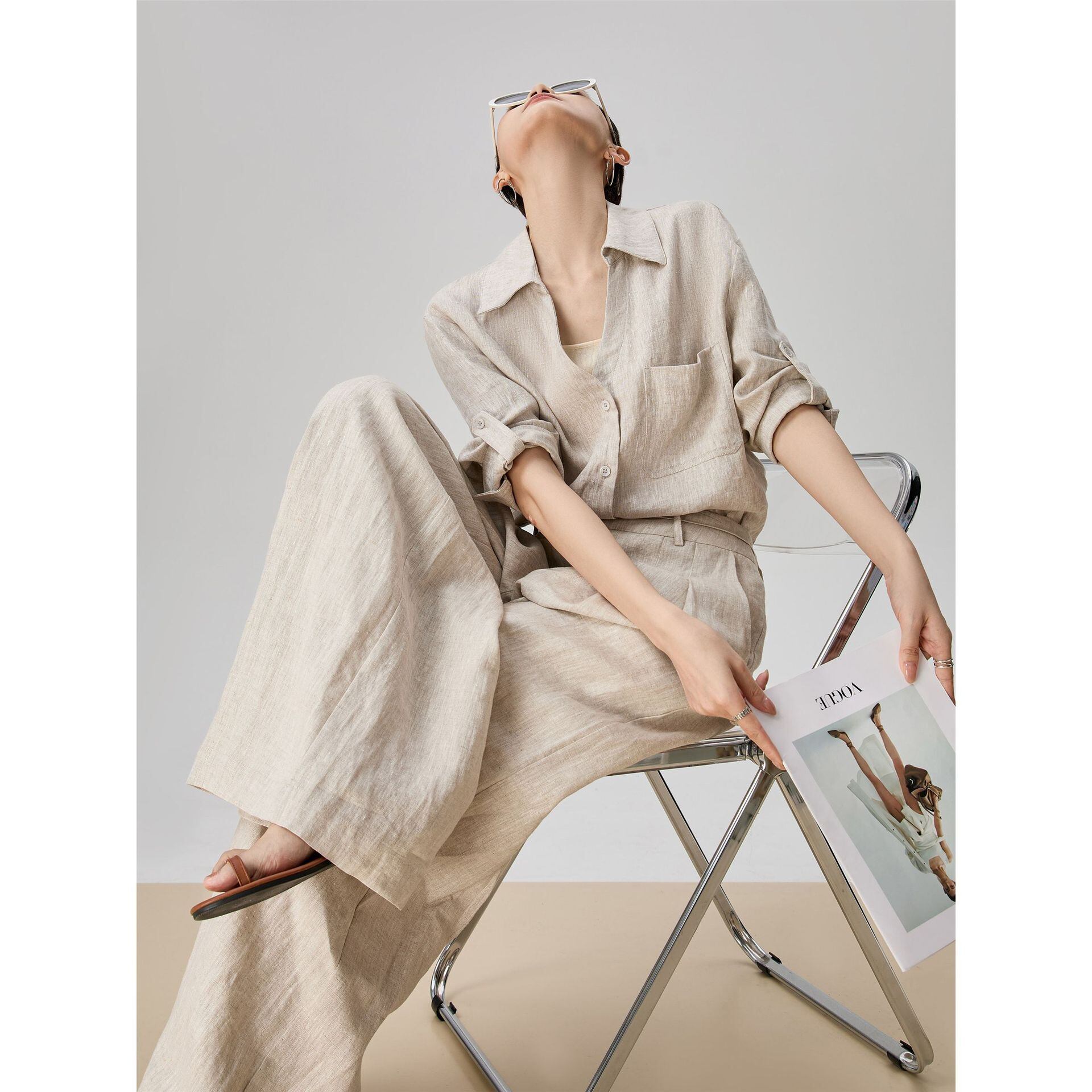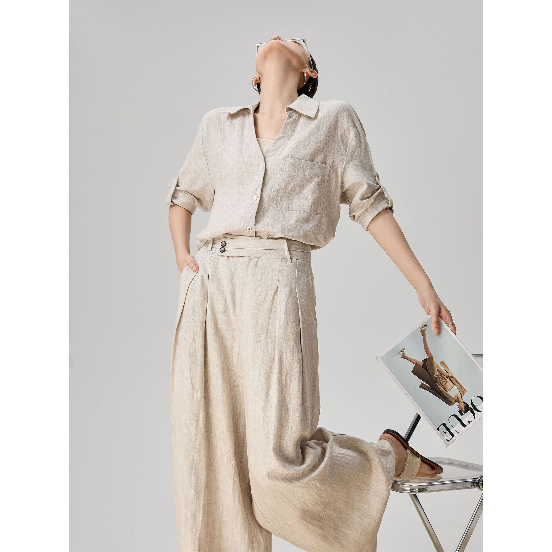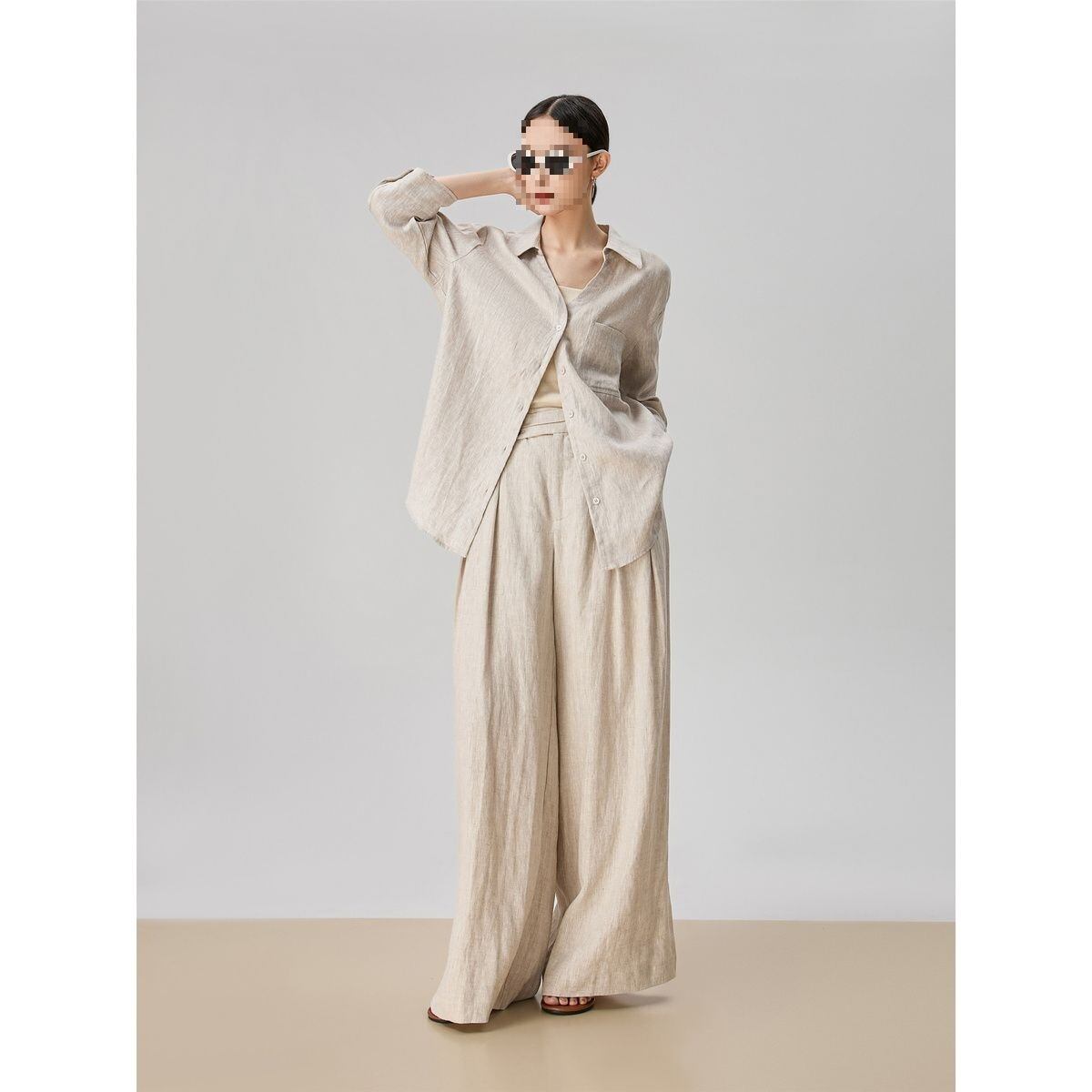 シンプルなリネン素材を使用したvネックシャツとワイドパンツの組み合わせで、軽やかさとエレガンスさを兼ね備えています。