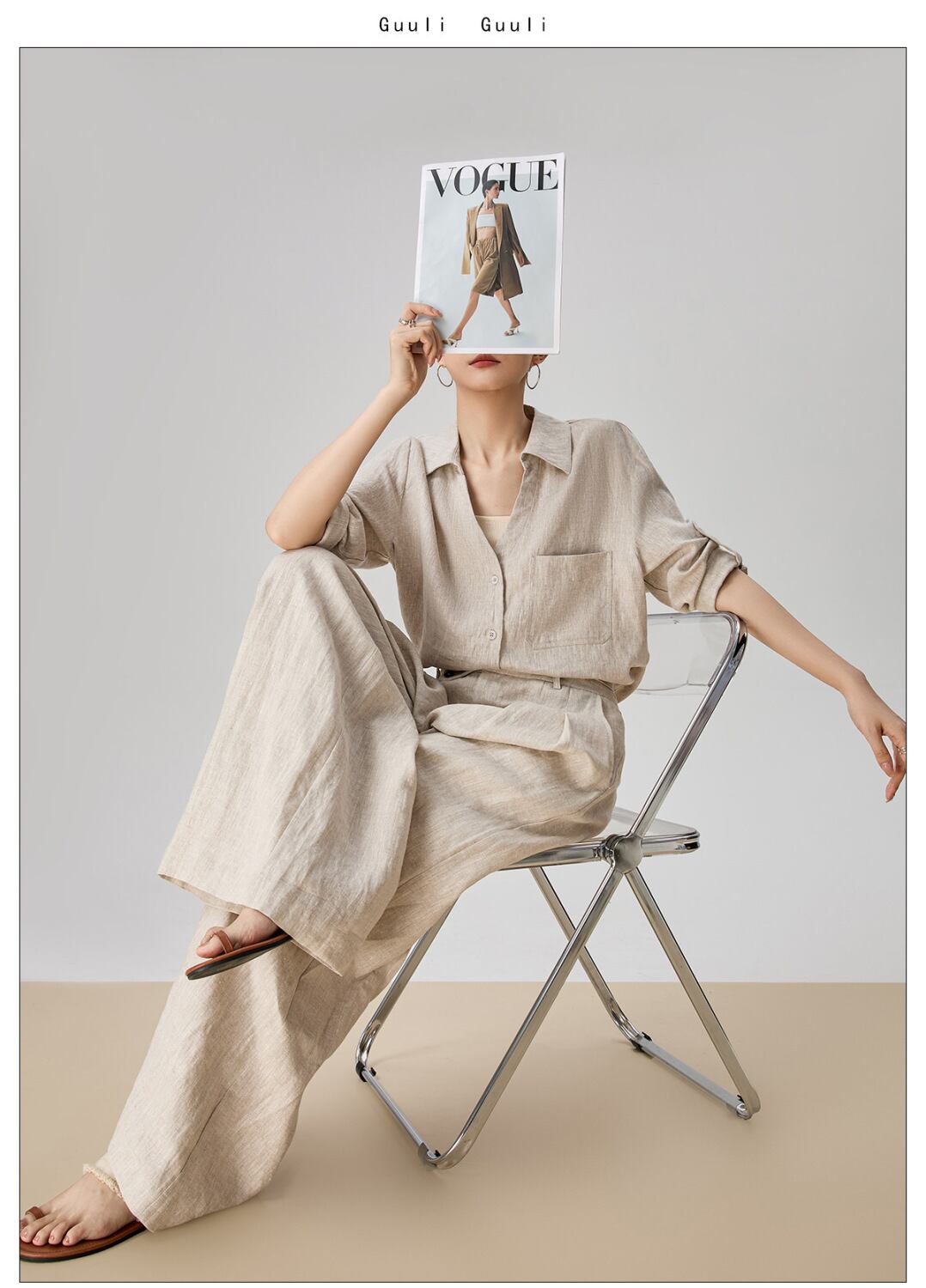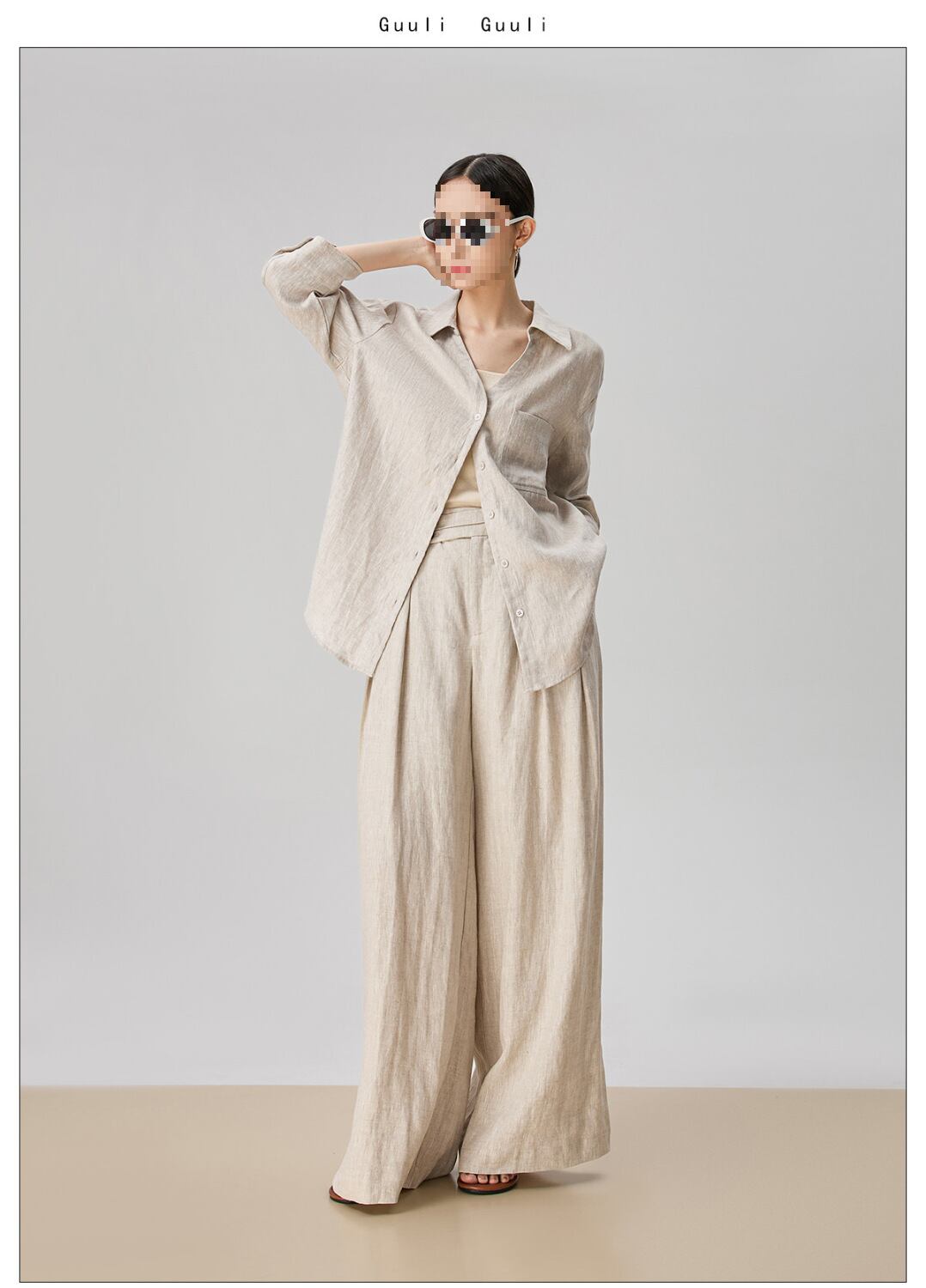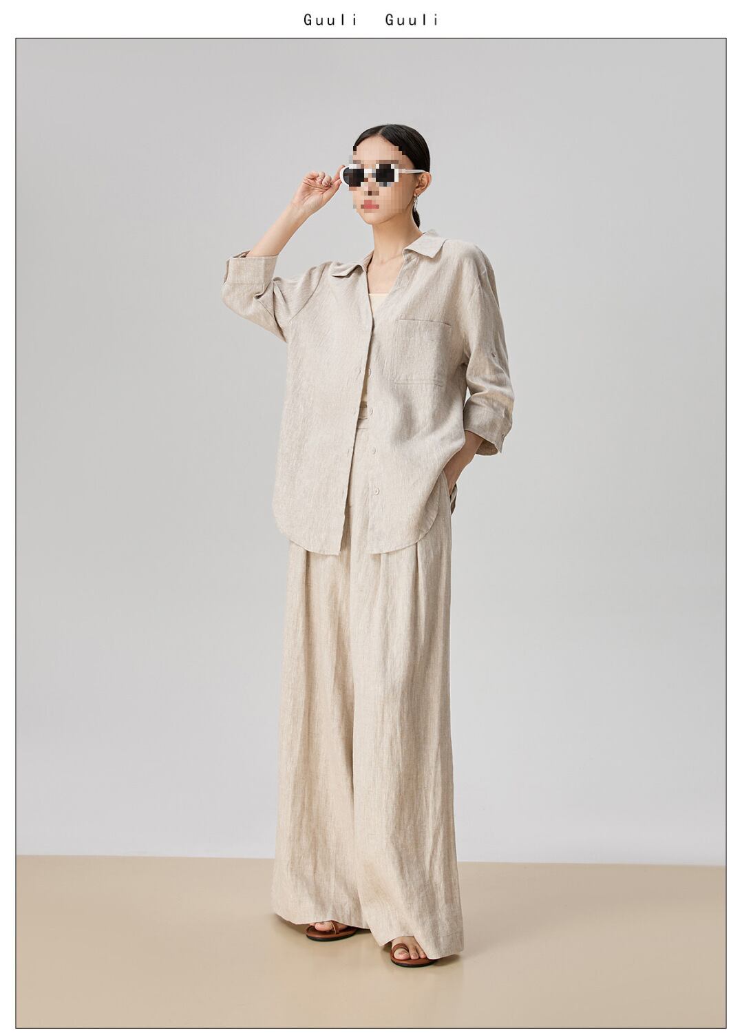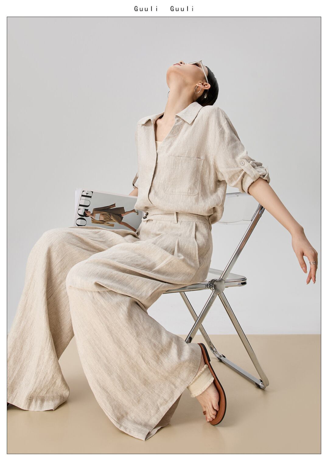 シンプルなリネン素材を使用したvネックシャツとワイドパンツの組み合わせで、軽やかさとエレガンスさを兼ね備えています。
