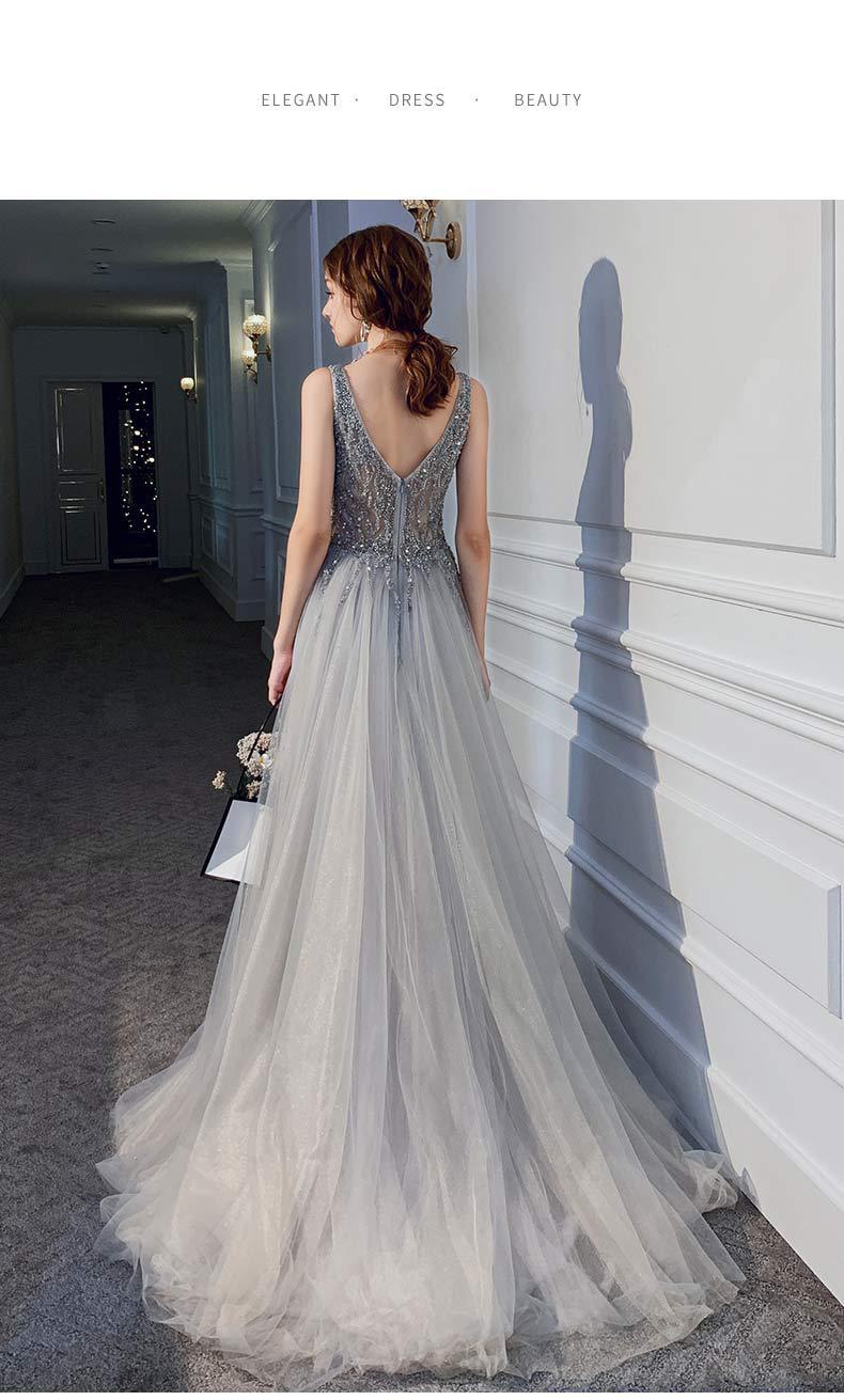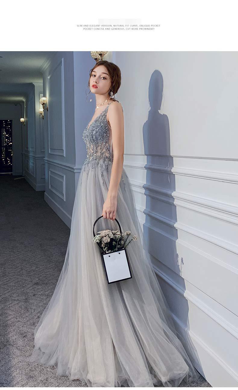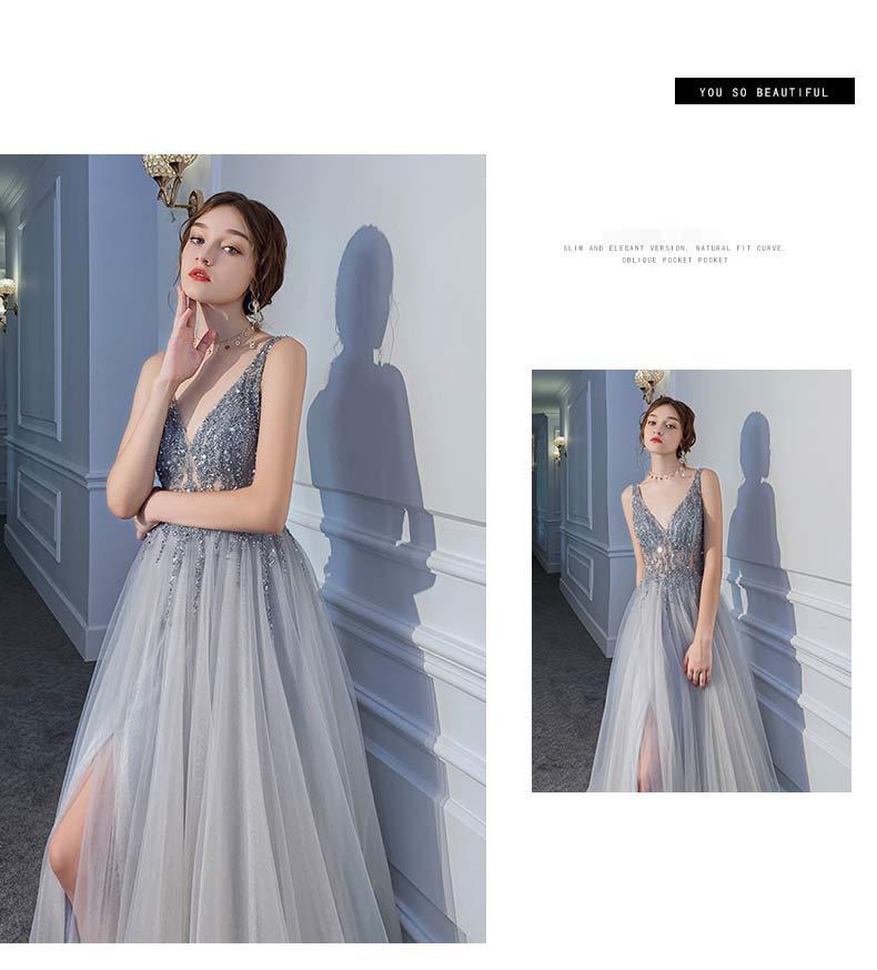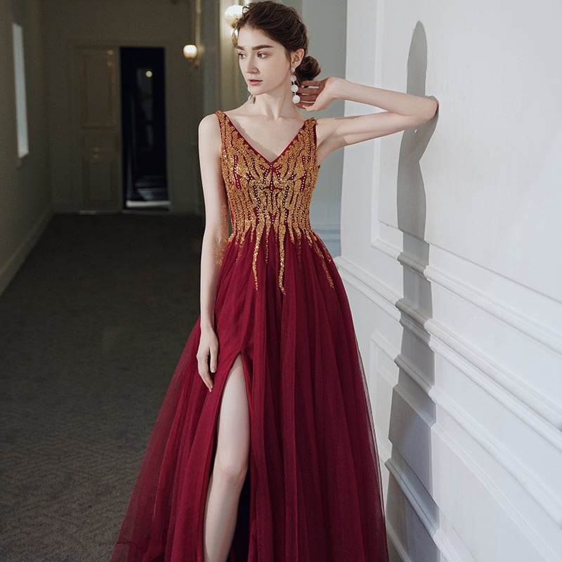 深いvネックデザインはデコルテラインを引き立て、胸元のきらびやかなスパンコールが一層の華やかさをプラスします。