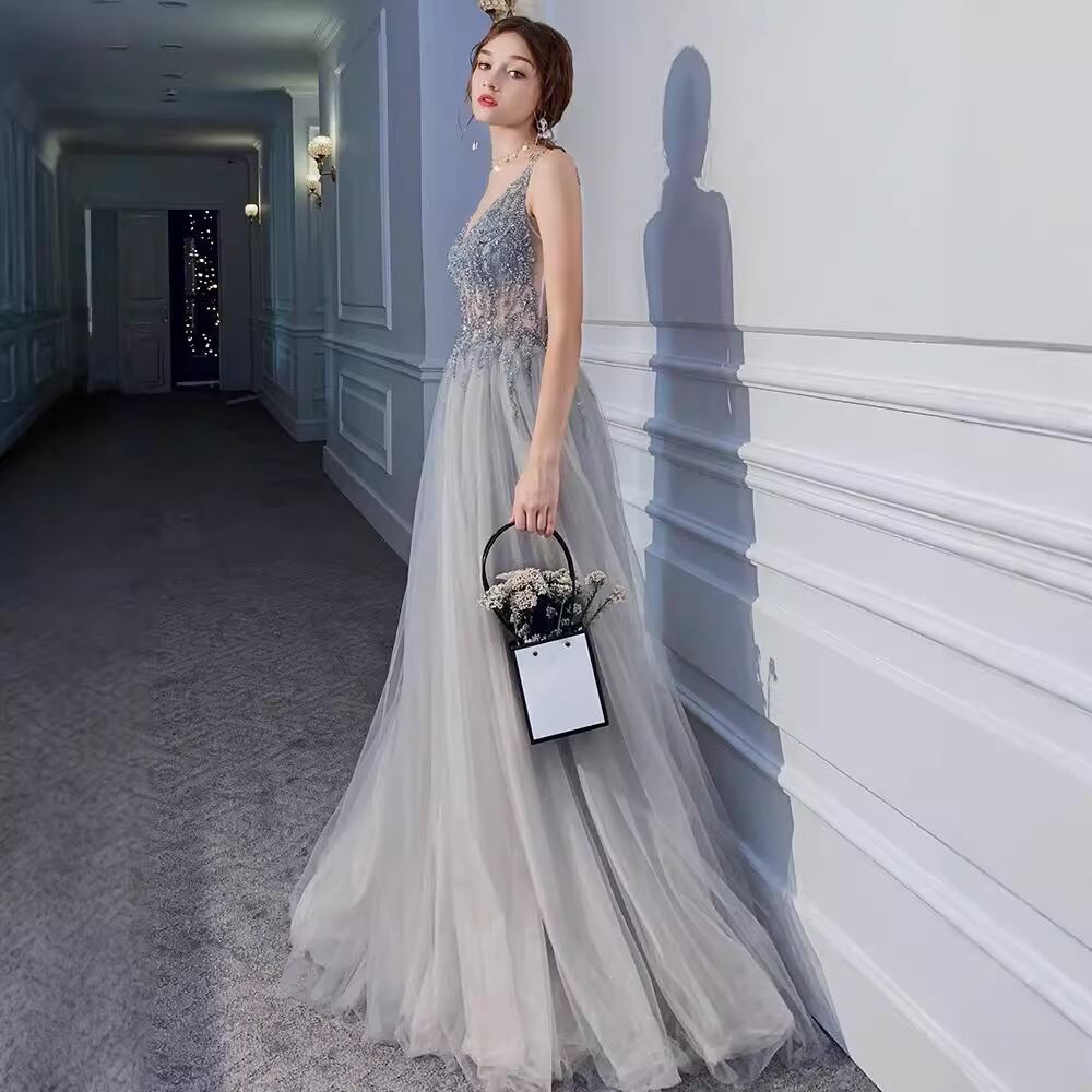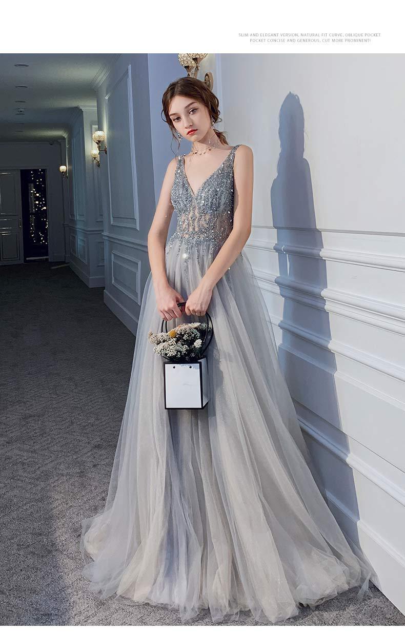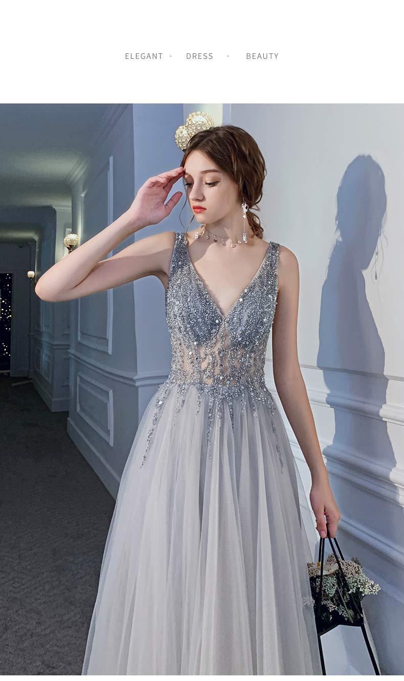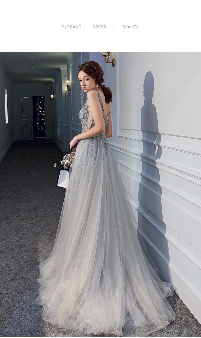 深いvネックデザインはデコルテラインを引き立て、胸元のきらびやかなスパンコールが一層の華やかさをプラスします。