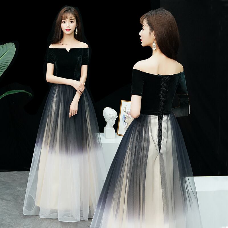 グラデーションカラーのチュールが上品な印象を添え、バックスタイルはセクシーなレースアップ仕様。