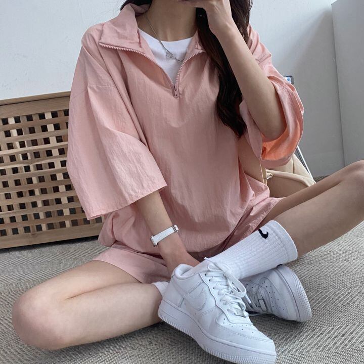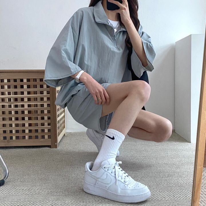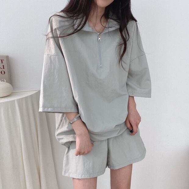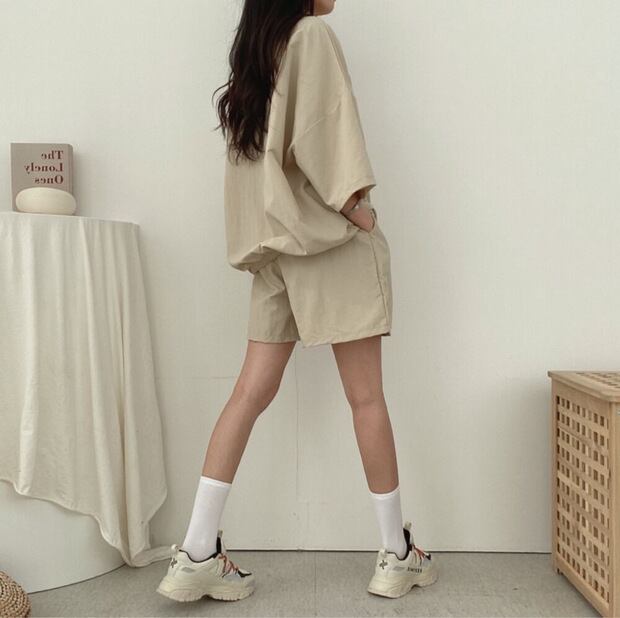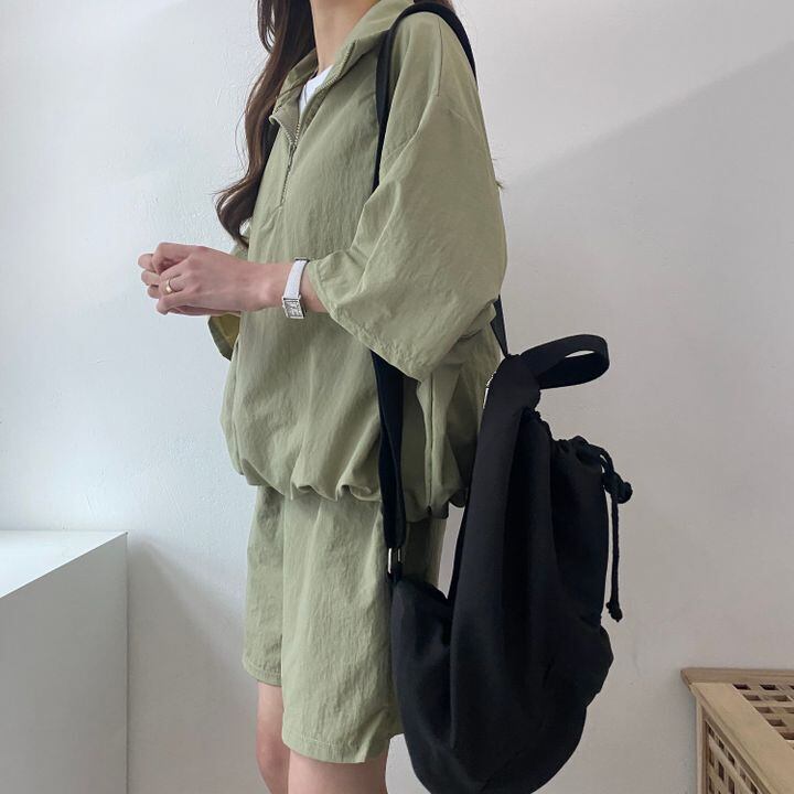 シャカシャカ素材のスポーティなトップスとショートパンツの組み合わせは、春から秋まで活躍間違いなし。