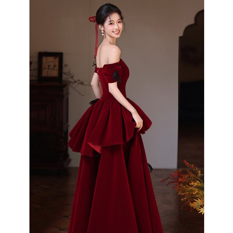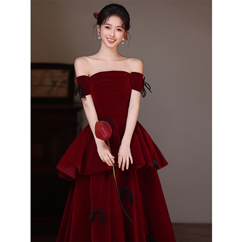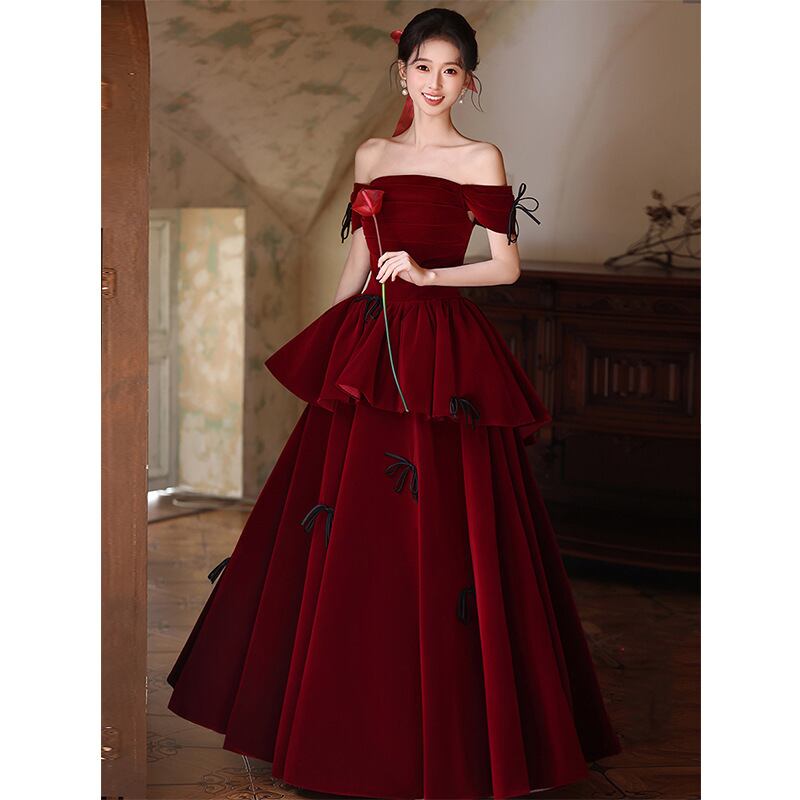この美しいワインレッドのドレスは、異素材のリボンが施されたオフショルダーのデザインで、幅広い年代の方にお楽しみいただけます。
