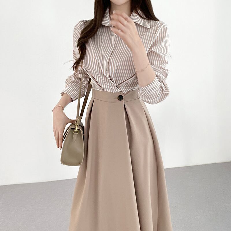 【ワンピース】 ワンピース レディース 春 秋 冬 おしゃれ 20代 30代 40代 ストライプ バイカラー ロングワンピース 入園式 卒園式 入学式 卒業式 春秋 長袖 七分袖 シャツ ワンピース ロング 韓国 ワンピース ドレス ワンピース 大人 可愛い きれいめ アプリコット ブルー 青 フリーサイズ
