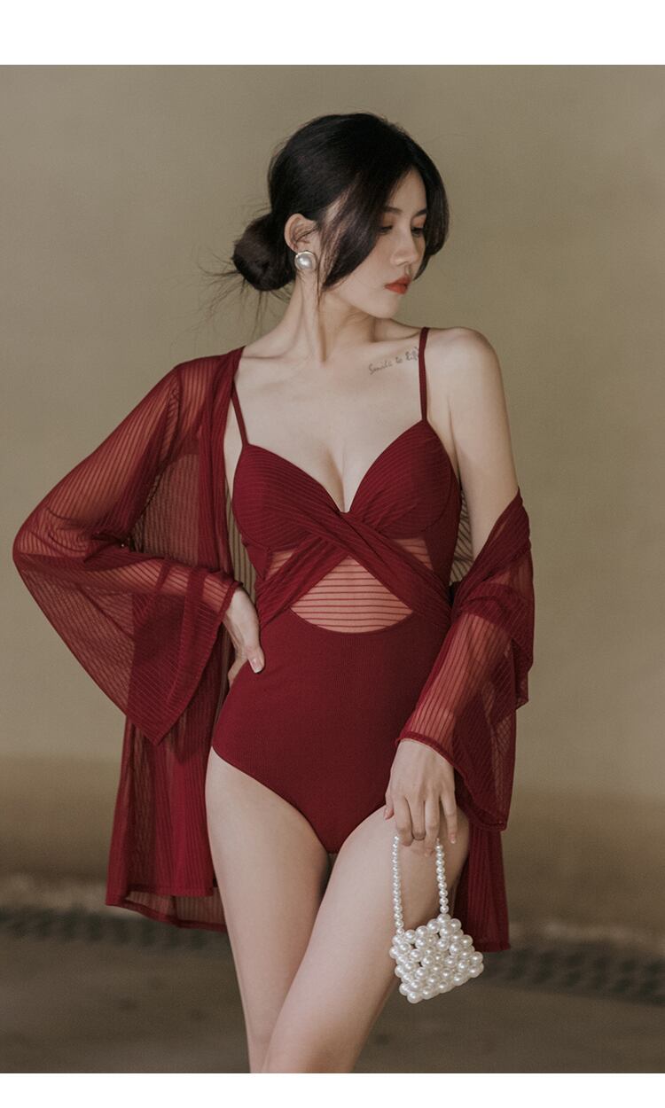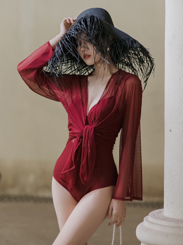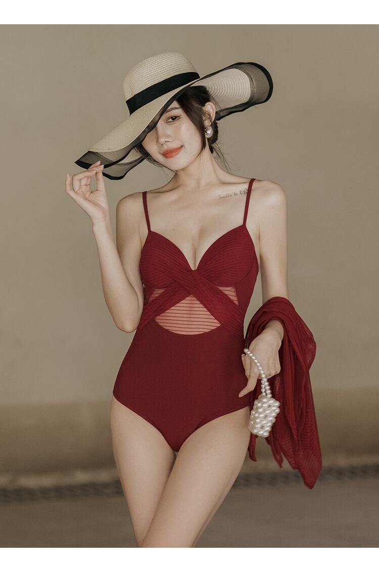 【水着】ワンピース 水着 レディース 体型カバー 韓国 水着 かわいい おしゃれ 水着 20代 30代 40代 オールインワン 水着 ぽっちゃり ママ 着痩せ 海 ビーチ プール リゾート シースルー セクシー ワインレッド 赤 S M L