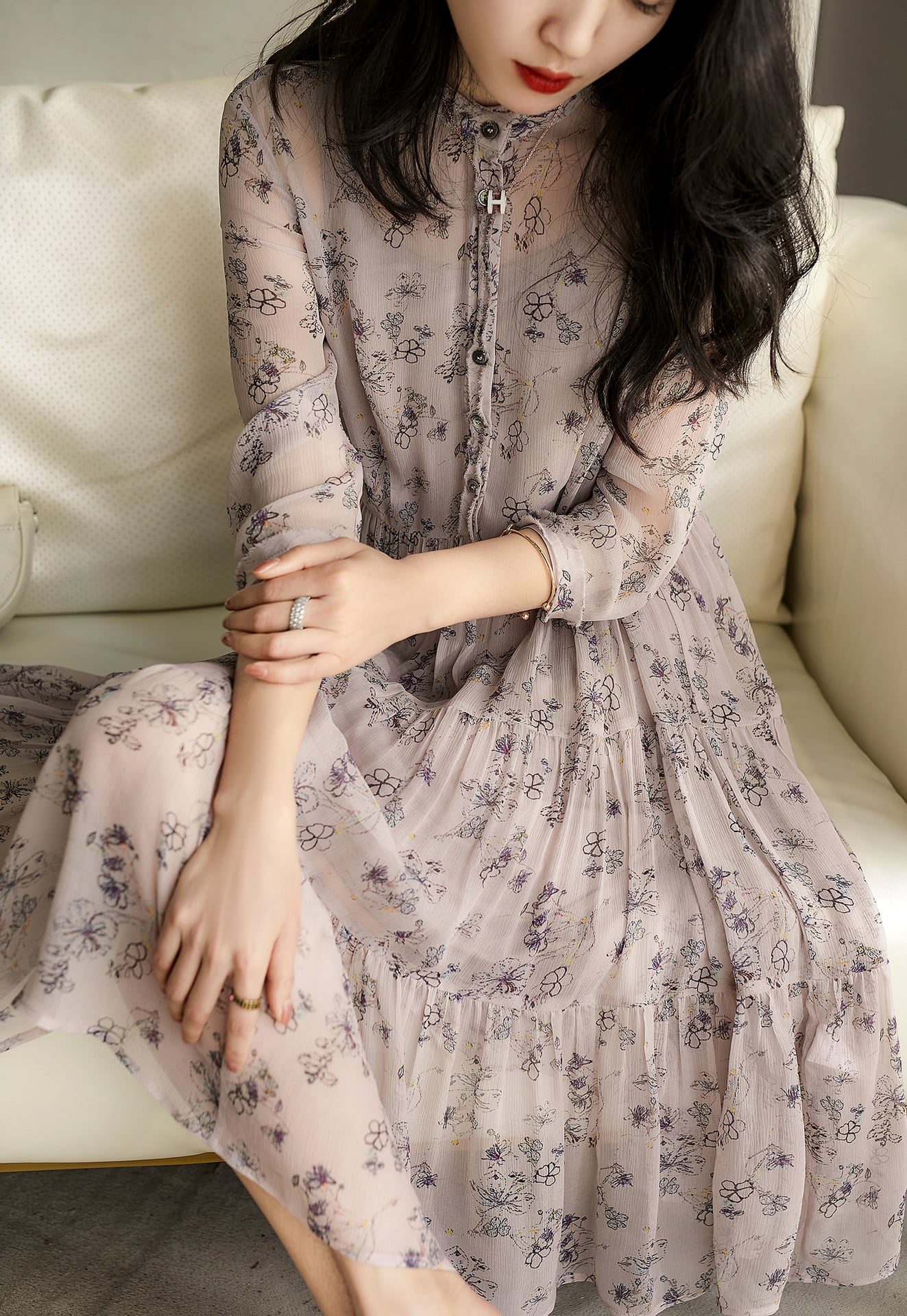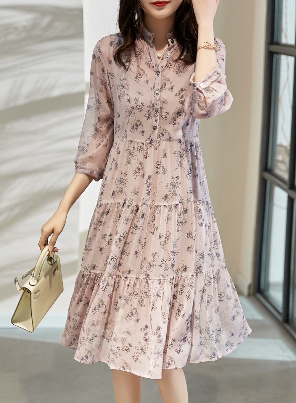 エレガントなモーブカラーの花柄膝丈ワンピース。