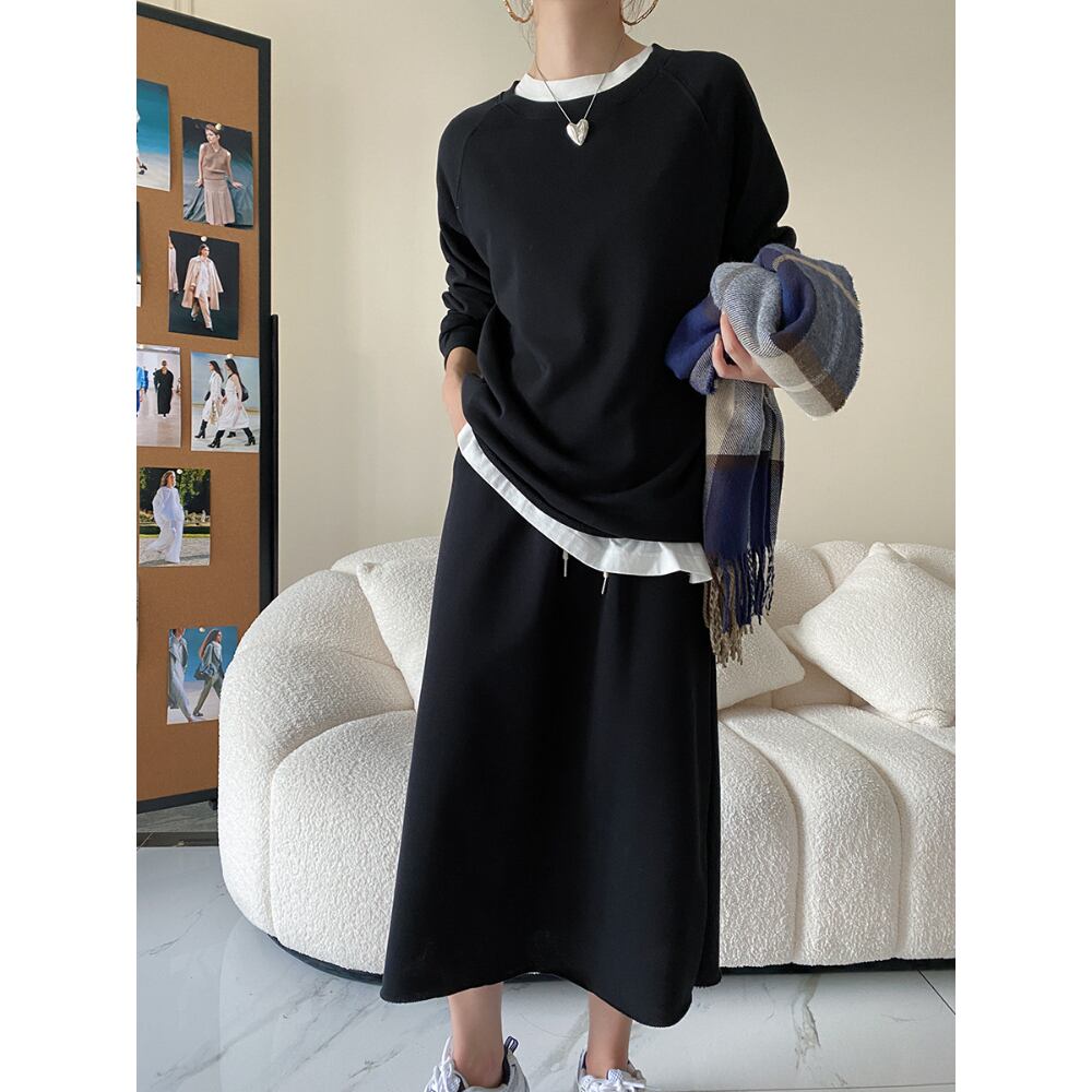 カジュアルなスウェットトレーナー&スカートのセットアップ。