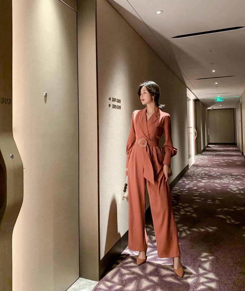 大人かっこいいブリックレッドカラーのパンツドレス。