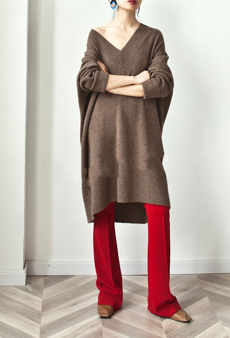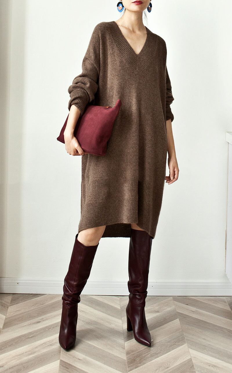 カジュアルなミドル丈Vネックニットワンピ。