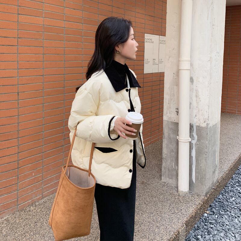 バイカラーの大人可愛いダウンジャケット。