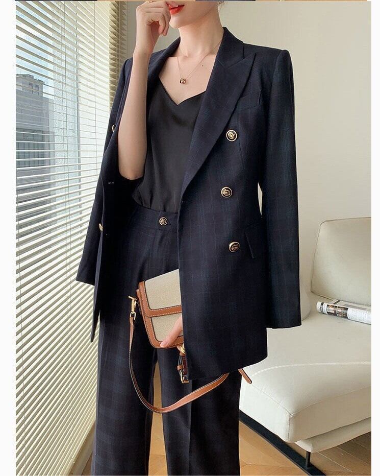 高見えすること間違いなしなネイビーチェックのパンツドレス。