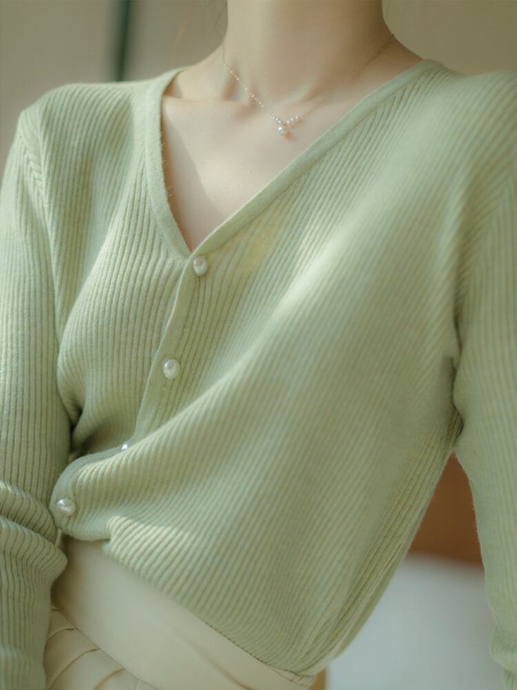 首回りを華奢に見せてくれるVネックとパールボタンがコーデのポイントに。