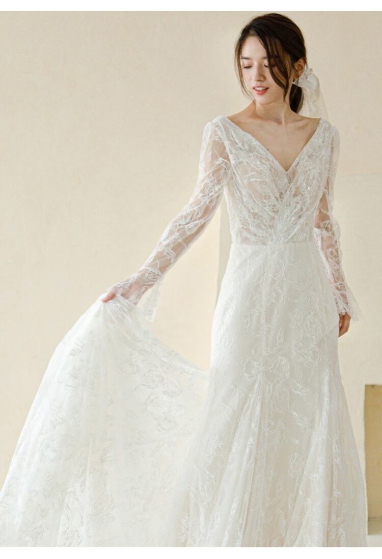 繊細なタッチのレース感がエレガントなウェディングドレス。